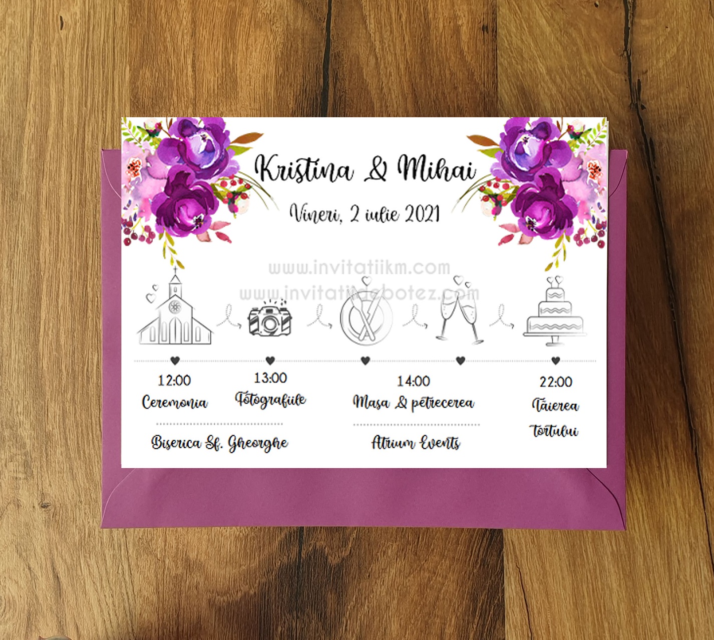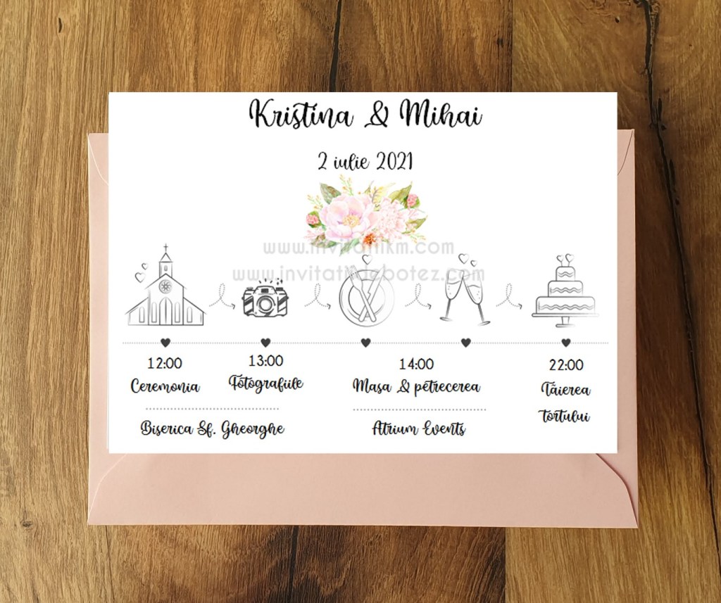 Invitatii de nunta tip timeline, cu programul nuntii, perfecte pentru cei care doresc o invitatie simplista, concisa