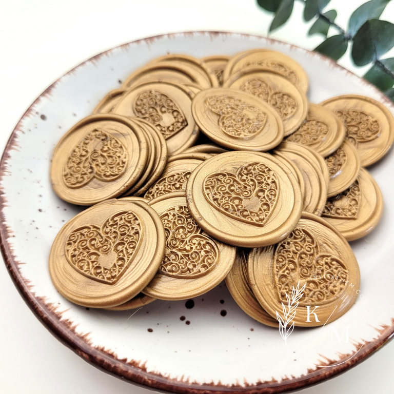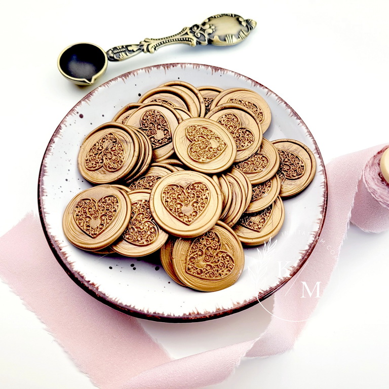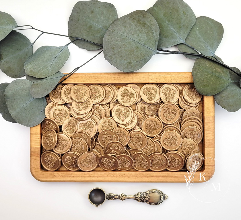 Sigilii de ceara autoadezive pentru invitatii de nunta sau de botez. Cele din poze sunt culoarea bronzului, dar pot fi realizate si pe alte culori. De asemenea, puteti comanda separat stampila cu alte forme in afara de inimioara sau chiar cu initialele voastre (pret aprox. 150 lei)