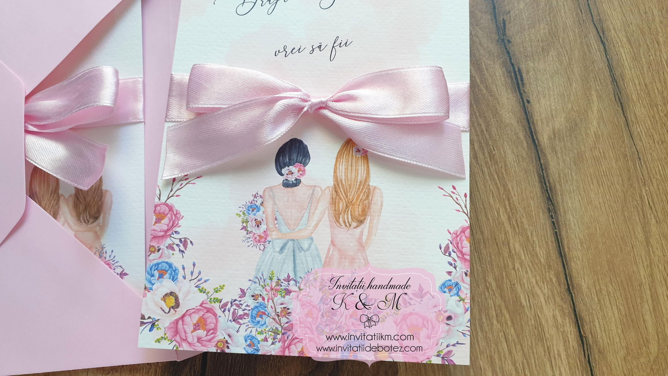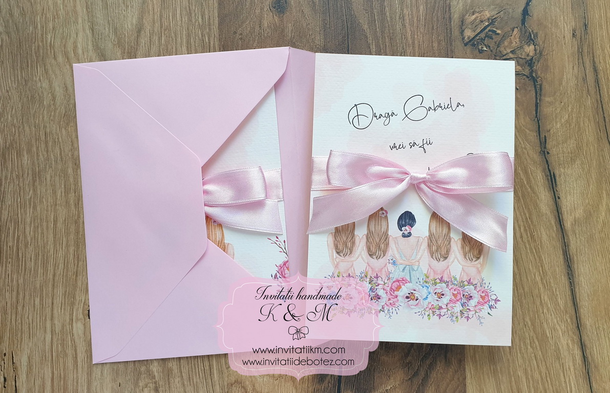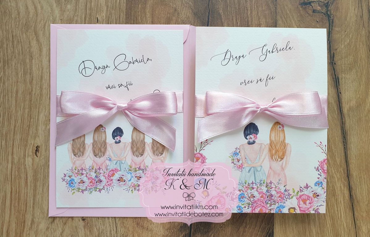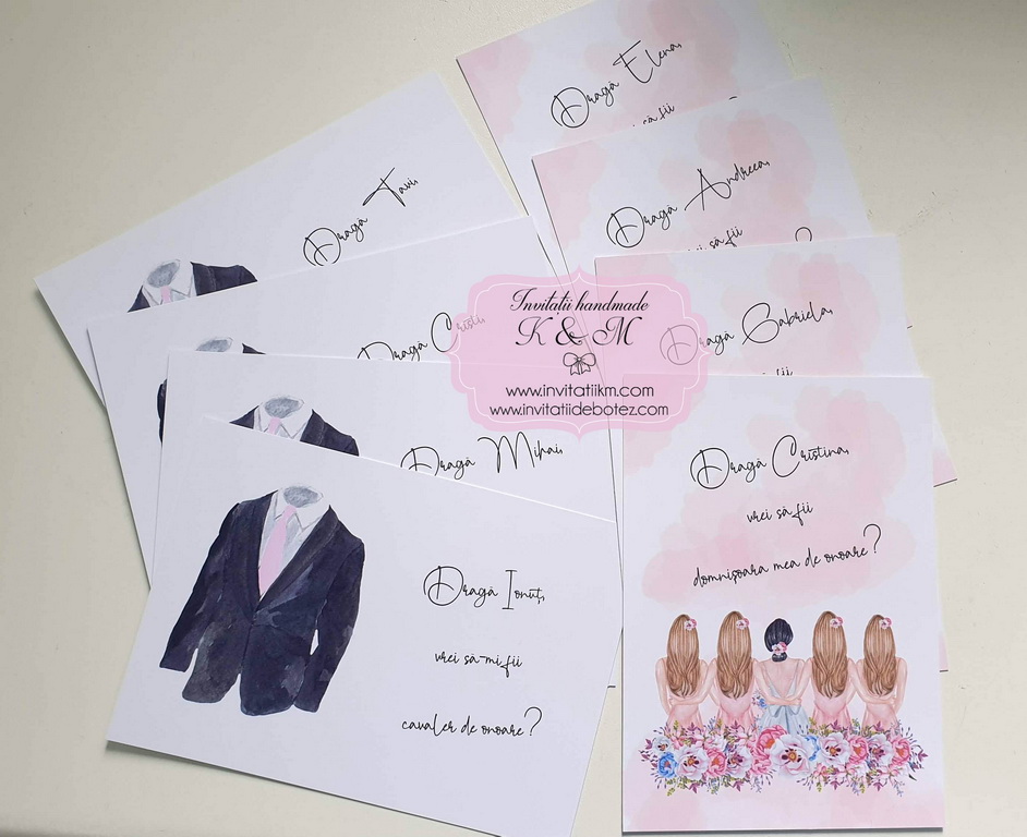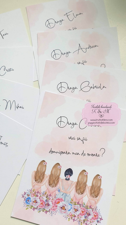 Invitatii pentru domnisoarele de onoare realizate din carton gros alb texturat, accesorizate cu fundita si plic colorat asortat, personalizate cu numele fiecarei domnisoare. Culorile se pot modifica in functie de preferinte (culori flori, par, fundite, plicuri), la fel si numarul domnisoarelor.