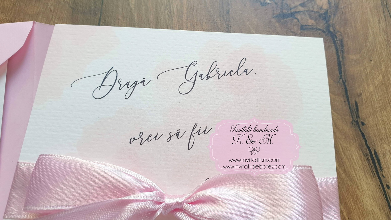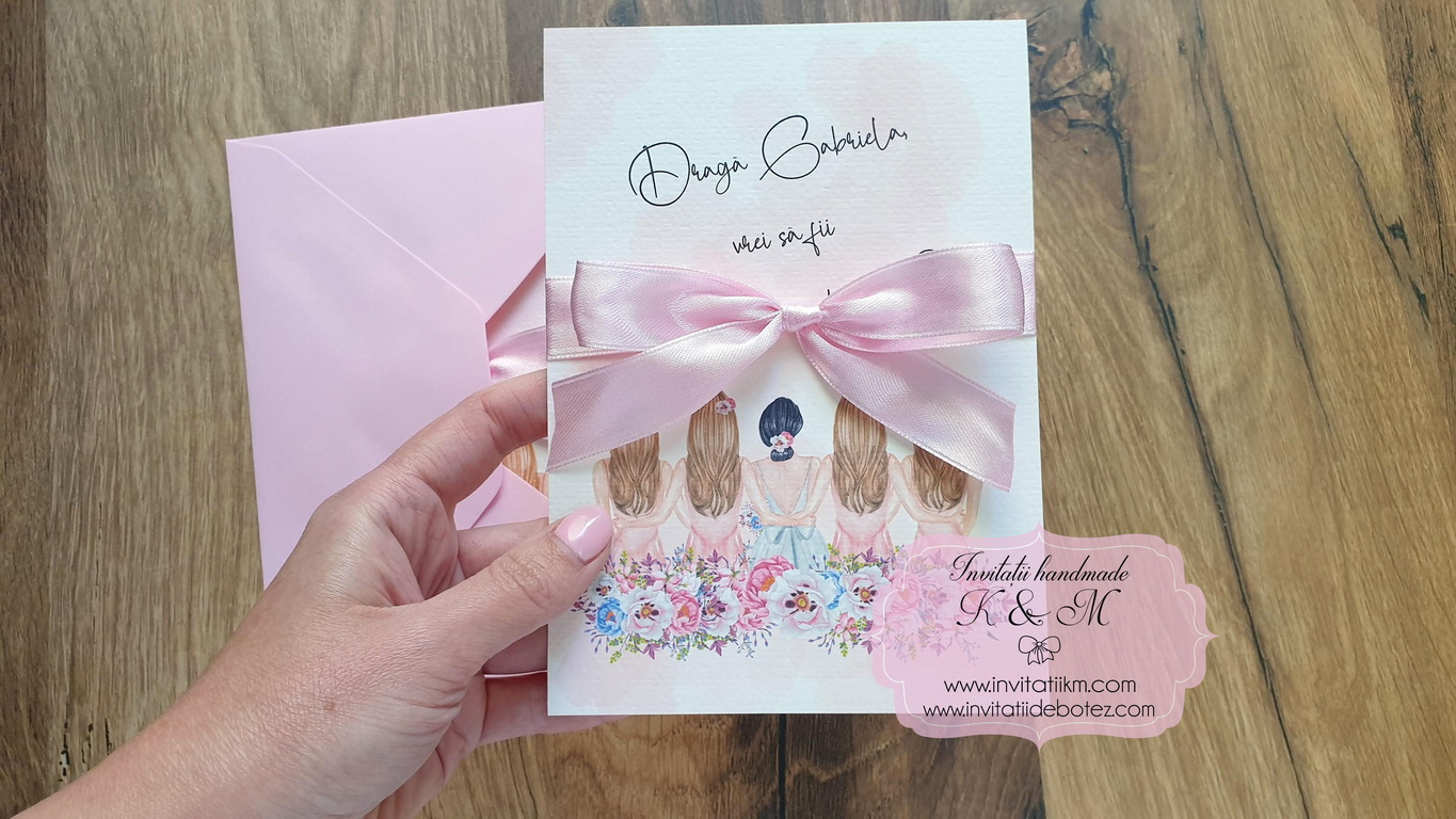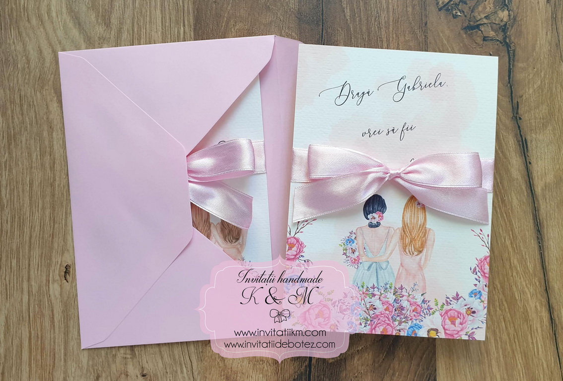 Invitatii pentru domnisoarele de onoare realizate din carton gros alb texturat, accesorizate cu fundita si plic colorat asortat, personalizate cu numele fiecarei domnisoare. Culorile se pot modifica in functie de preferinte (culori flori, par, fundite, plicuri), la fel si numarul domnisoarelor.