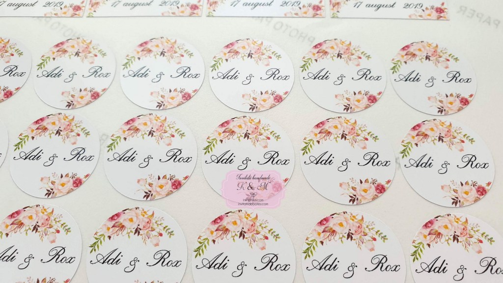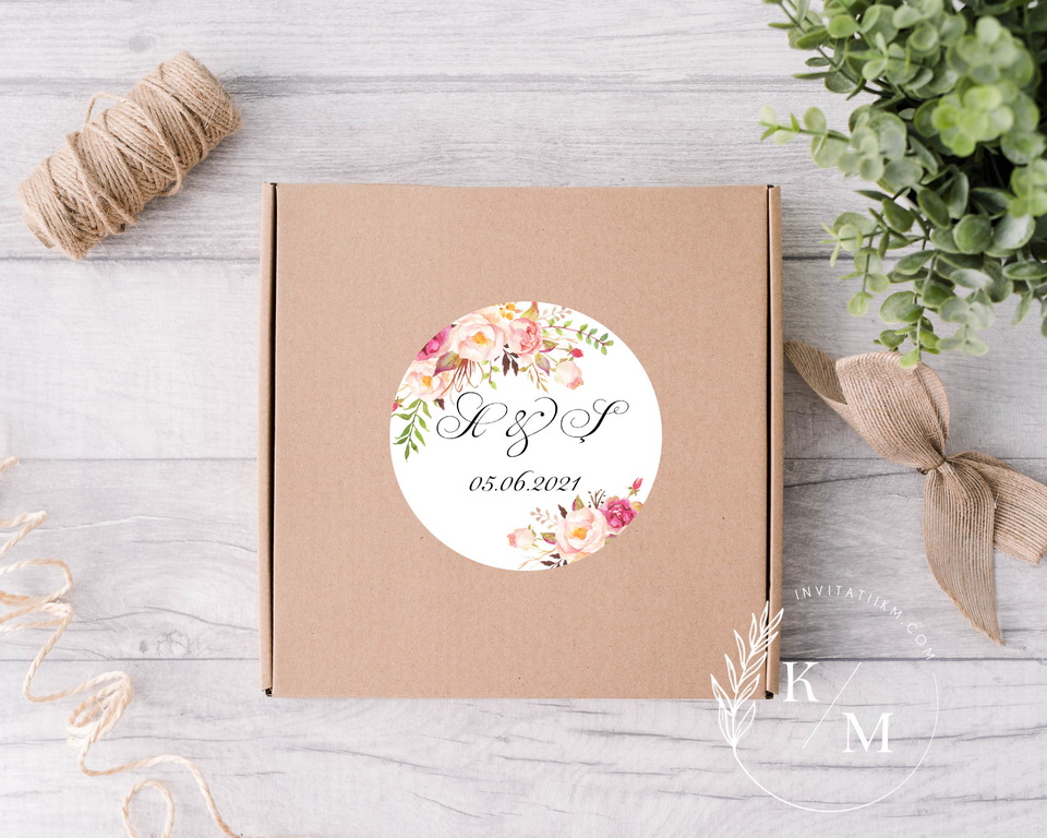 Etichete autocolante/stickere marturii nunta cu flori roz, somon