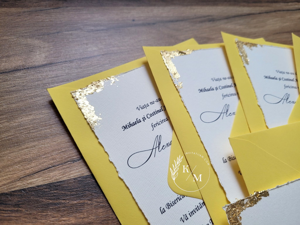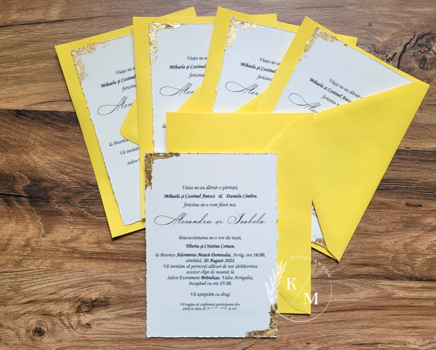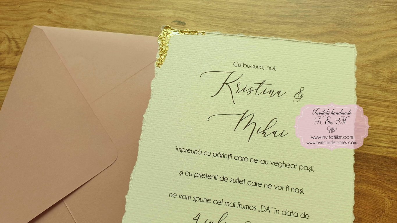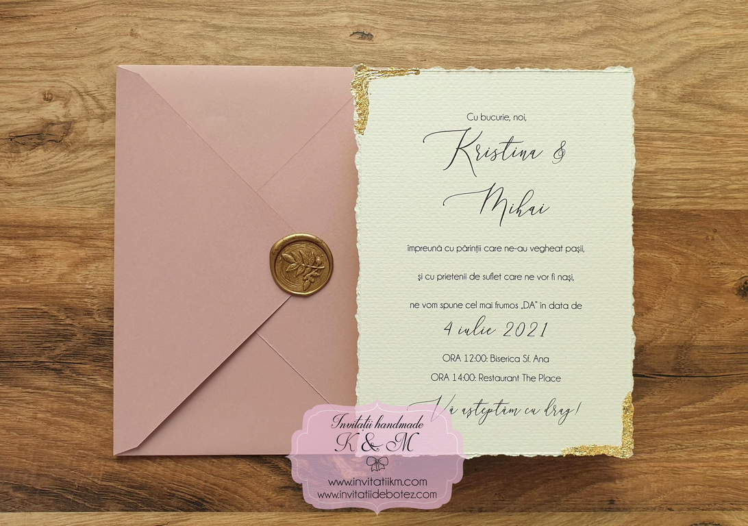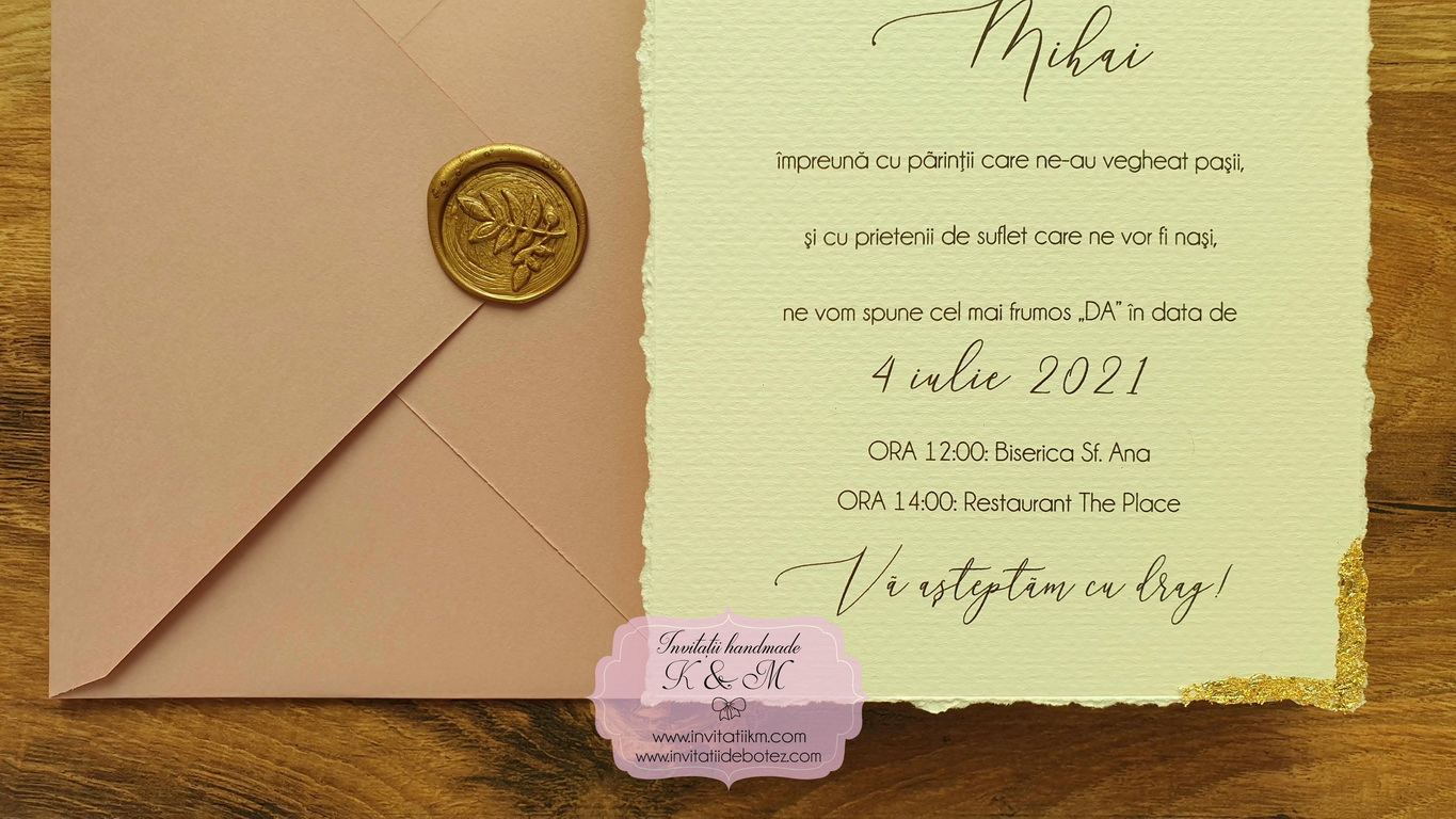 Varianta de invitatie din carton ivory texturat cu margini rupte manual, foita aurie aplicata manual, plic simplu asortat si sigiliu: 11.5 lei