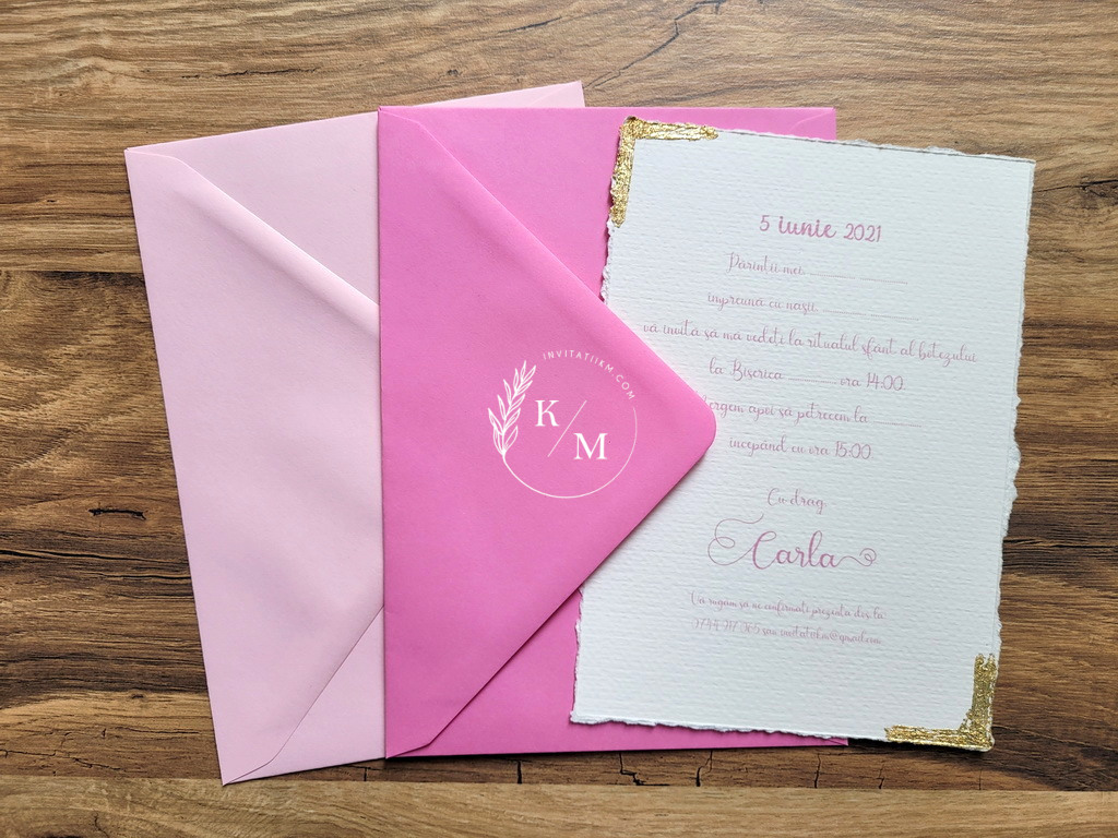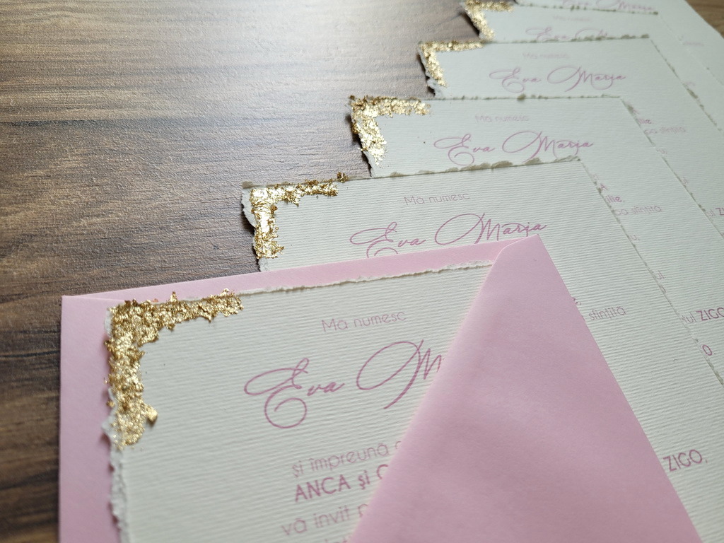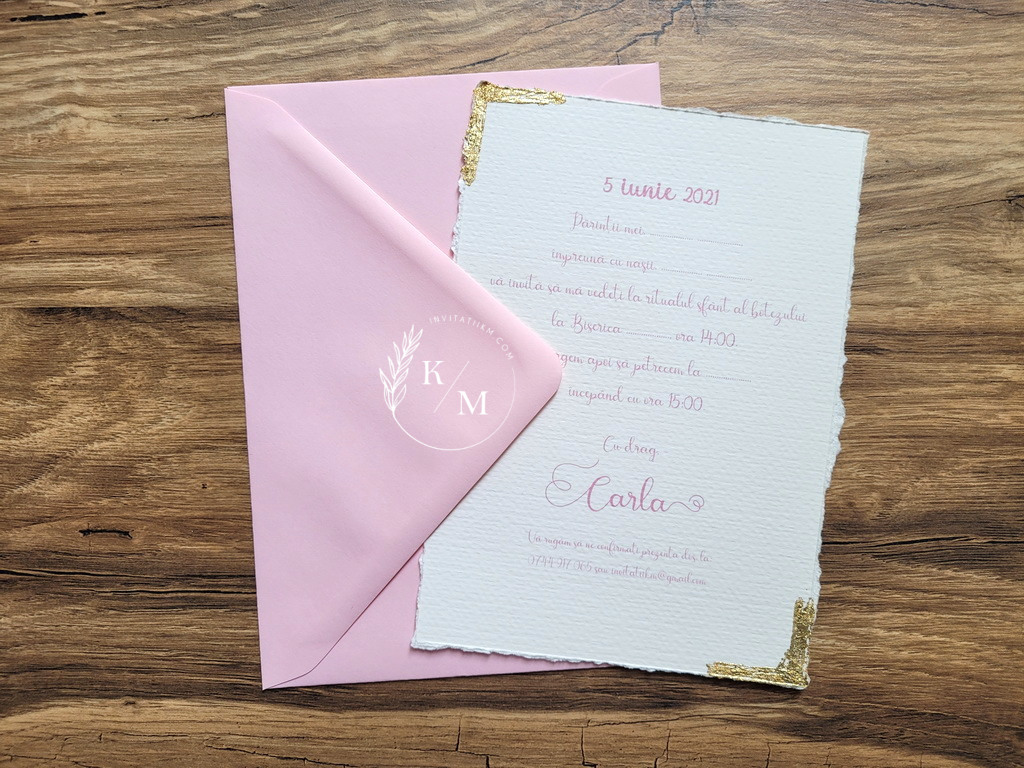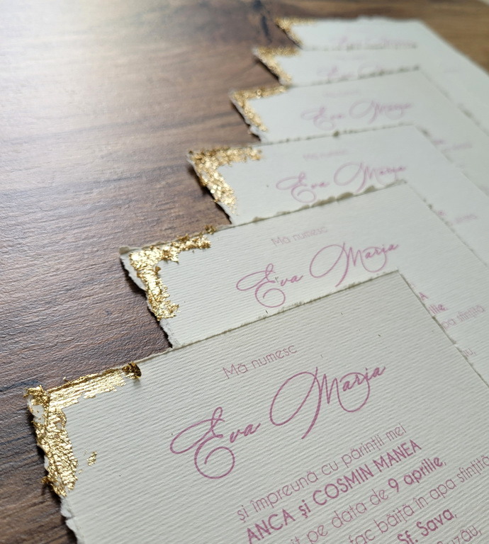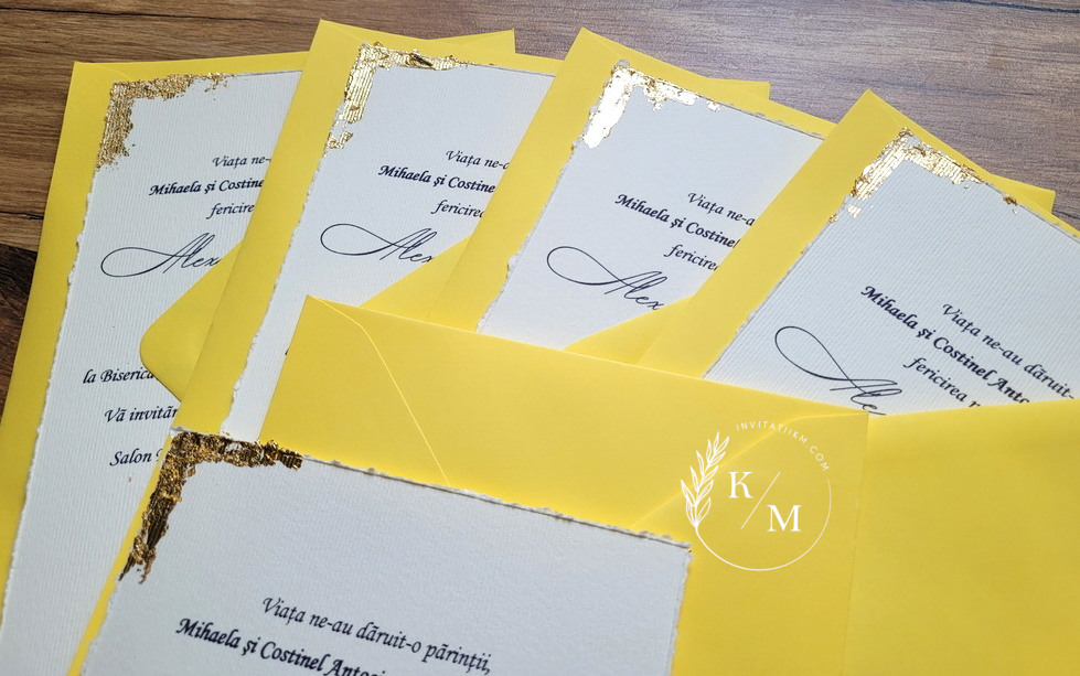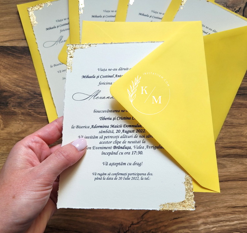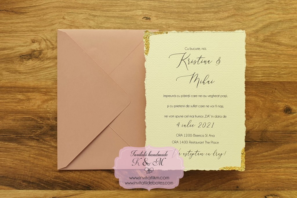 Varianta de invitatie din carton ivory texturat cu margini rupte manual, foita aurie aplicata manual, plic simplu asortat si sigiliu: 11.5 lei