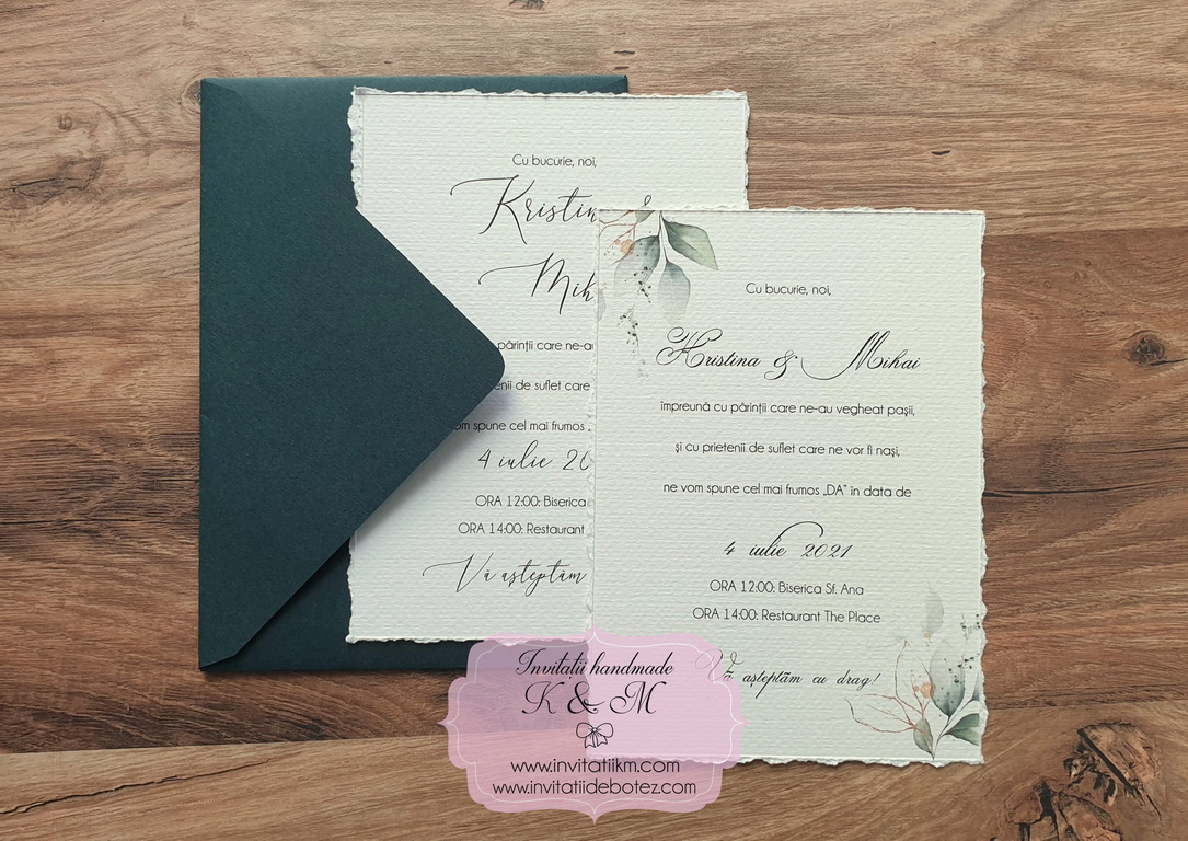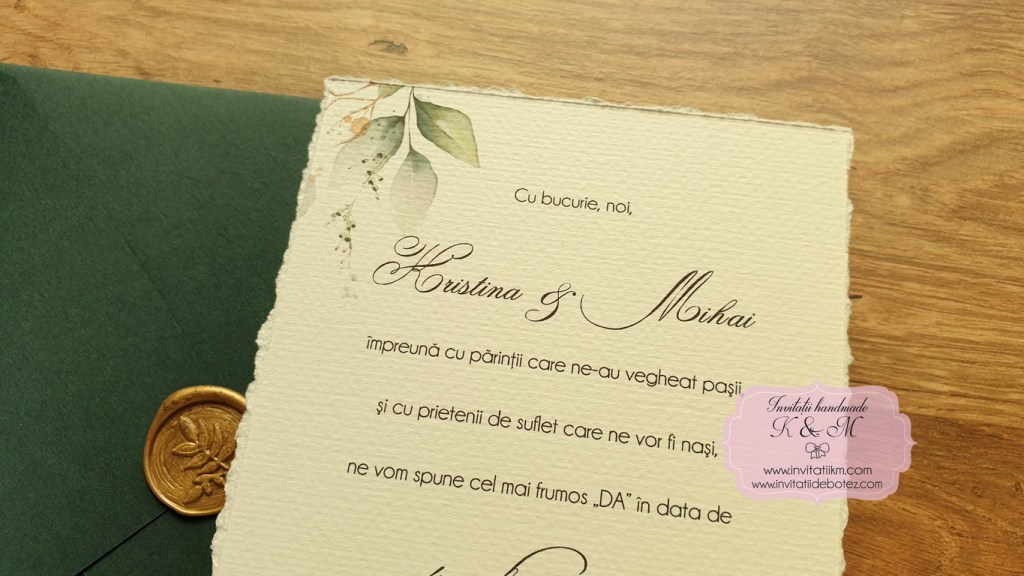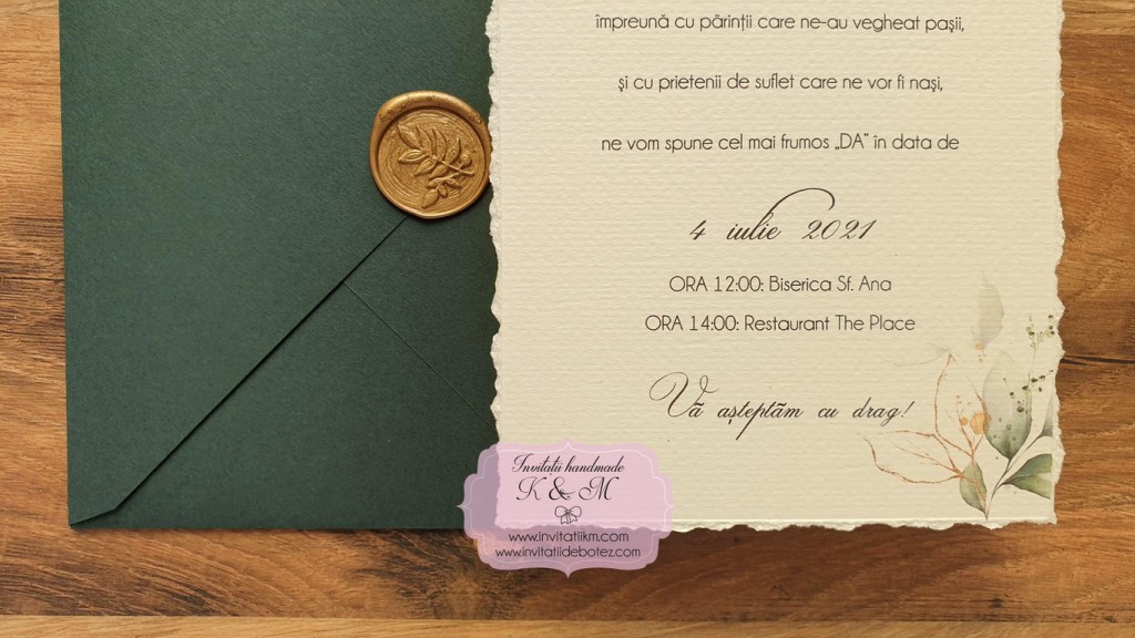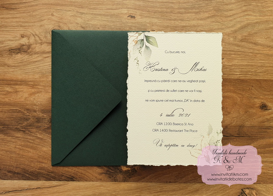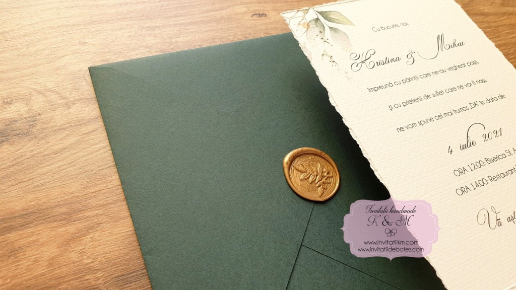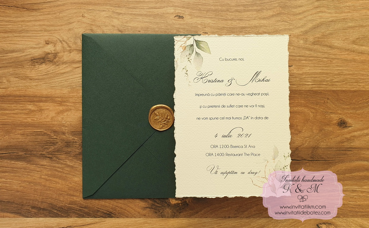Invitatii de nunta realizate din carton alb/ivory texturat, cu marginile neregulate, rupte manual, plic handmade verde inchis si sigiliu asortat (sigiliul este turnat la cald direct pe plic)