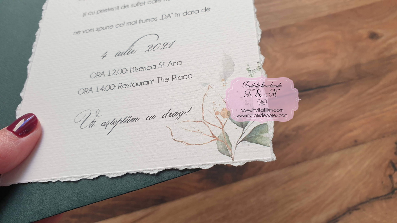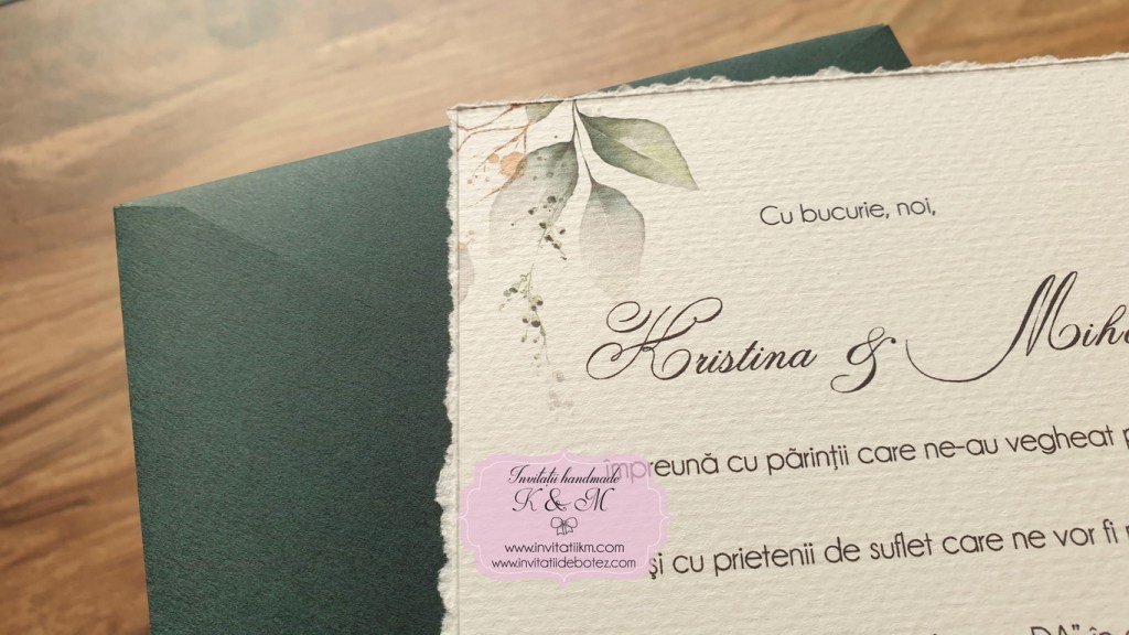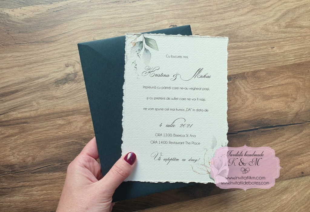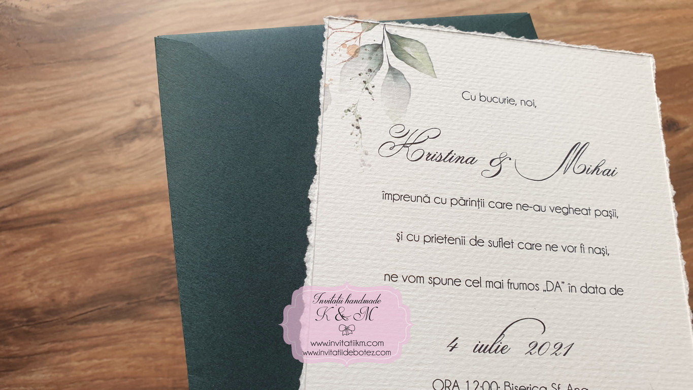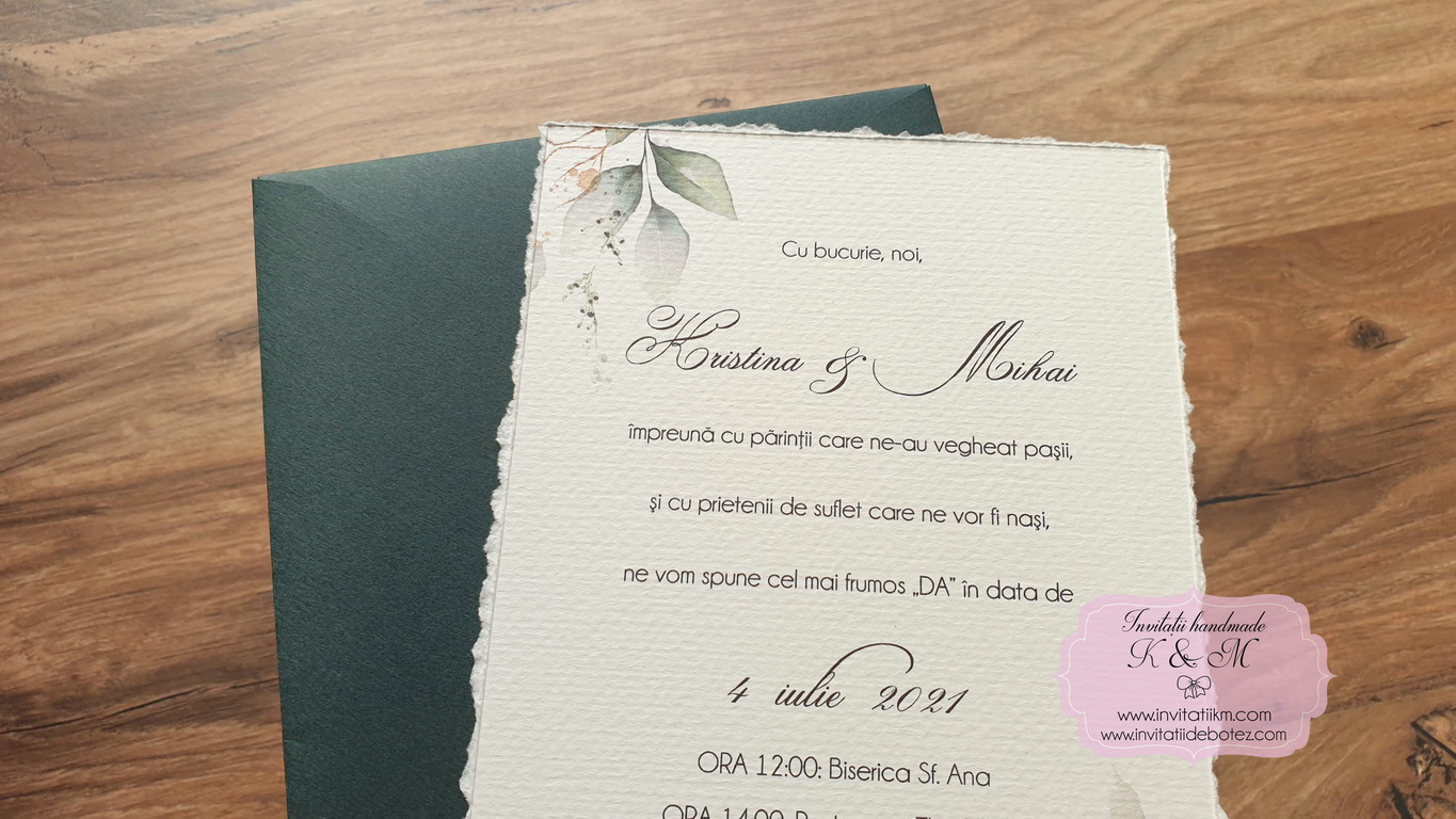 Invitatii de nunta realizate din carton alb/ivory texturat, cu marginile neregulate, rupte manual, plic handmade verde inchis si sigiliu asortat (sigiliul este turnat la cald direct pe plic)