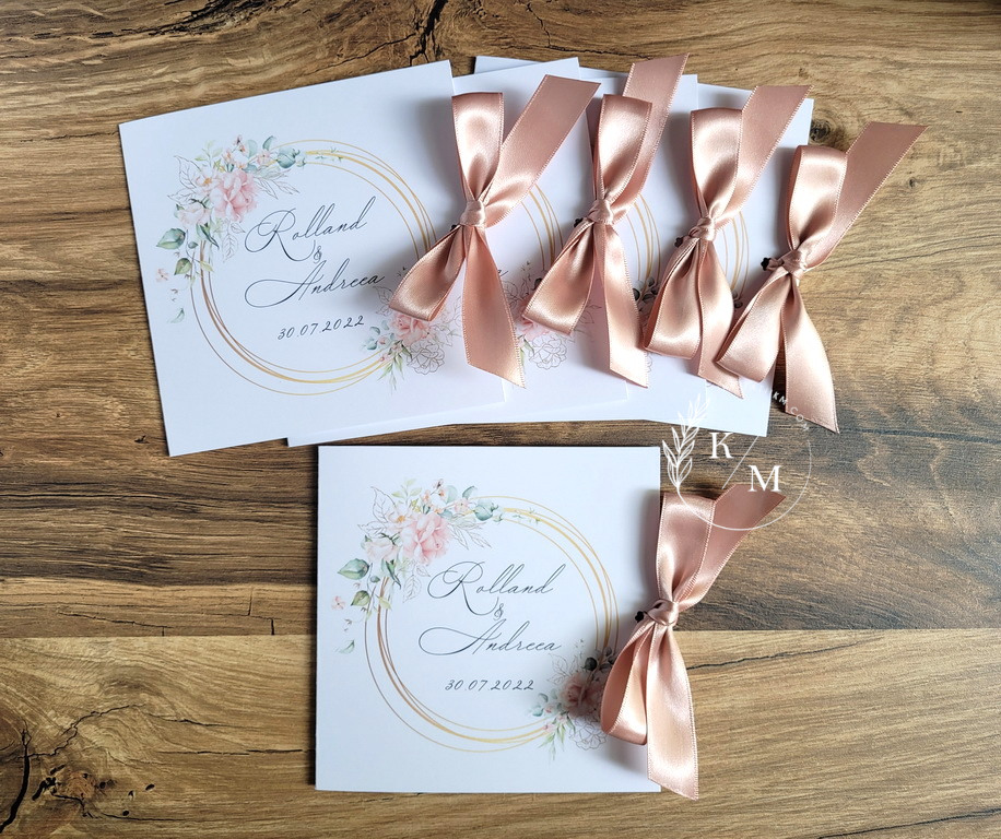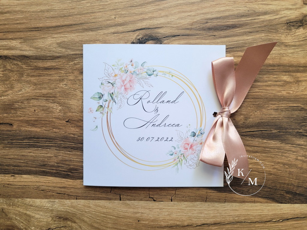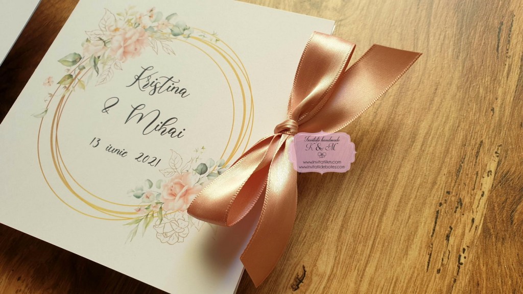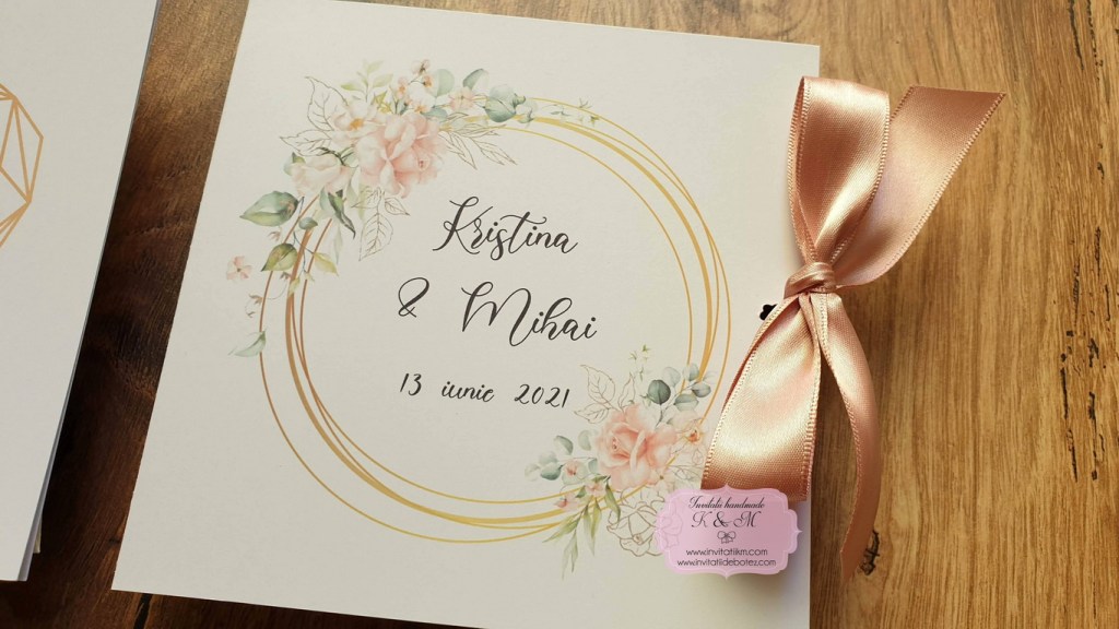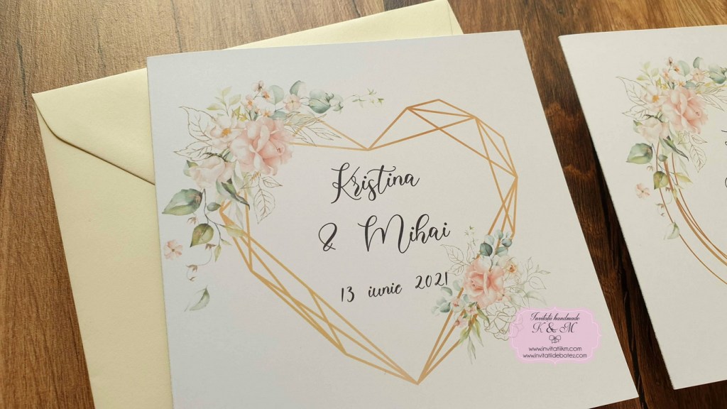 Invitatii de nunta realizate din carton gros, patrate, cu deschidere tip felicitare, print cu inimioare geometrice si flori roz piersica-somon-peach-blush, cu plicuri asortate sau fundite din satin in locul plicurilor