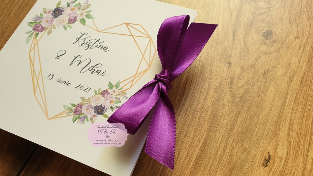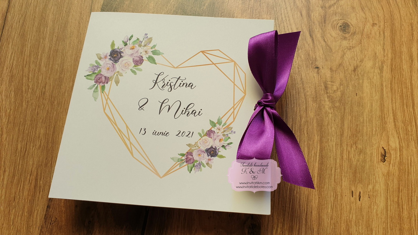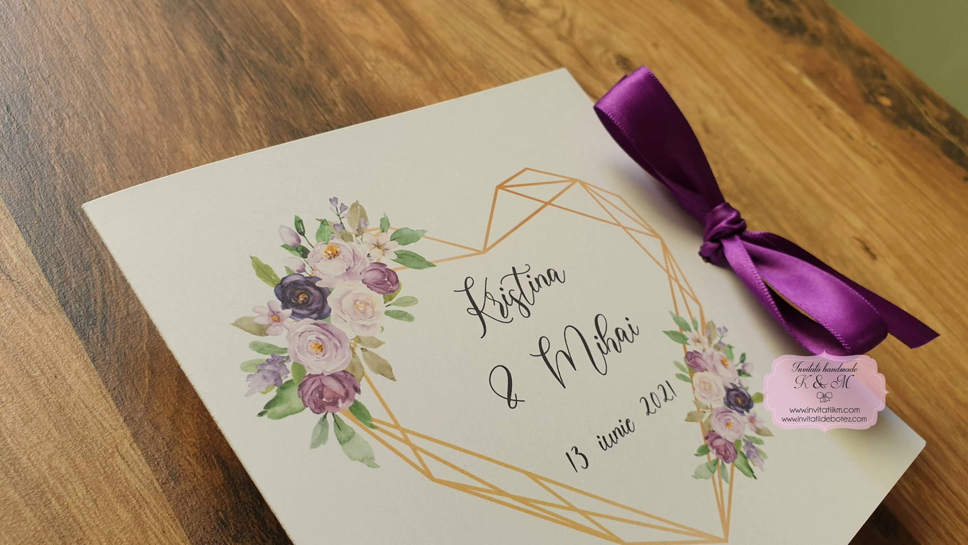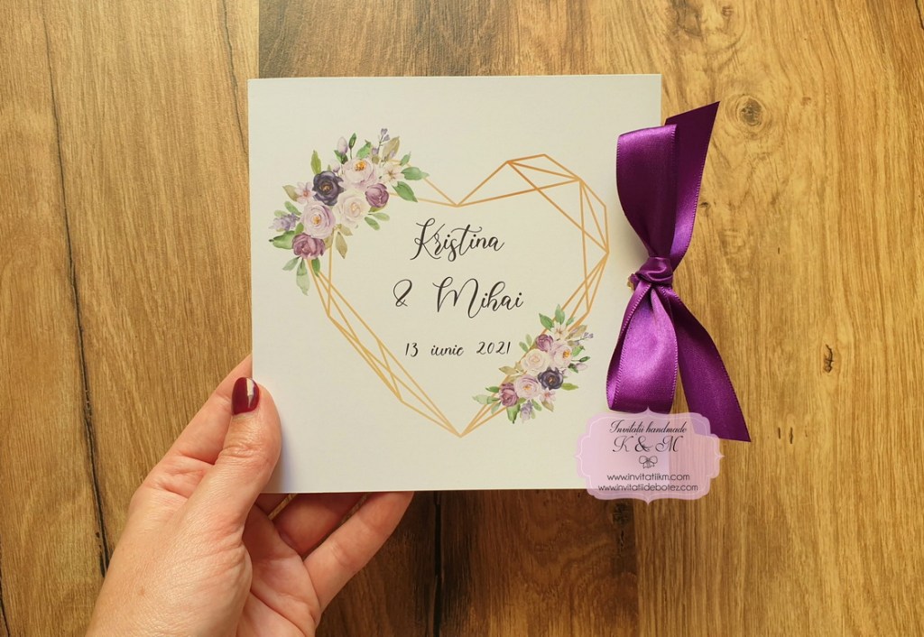 Invitatii de nunta realizate din carton gros, patrate, cu deschidere tip felicitare, print cu inimioare geometrice si flori mov-lila-lavanda, cu plicuri asortate sau fundite din satin in locul plicurilor
