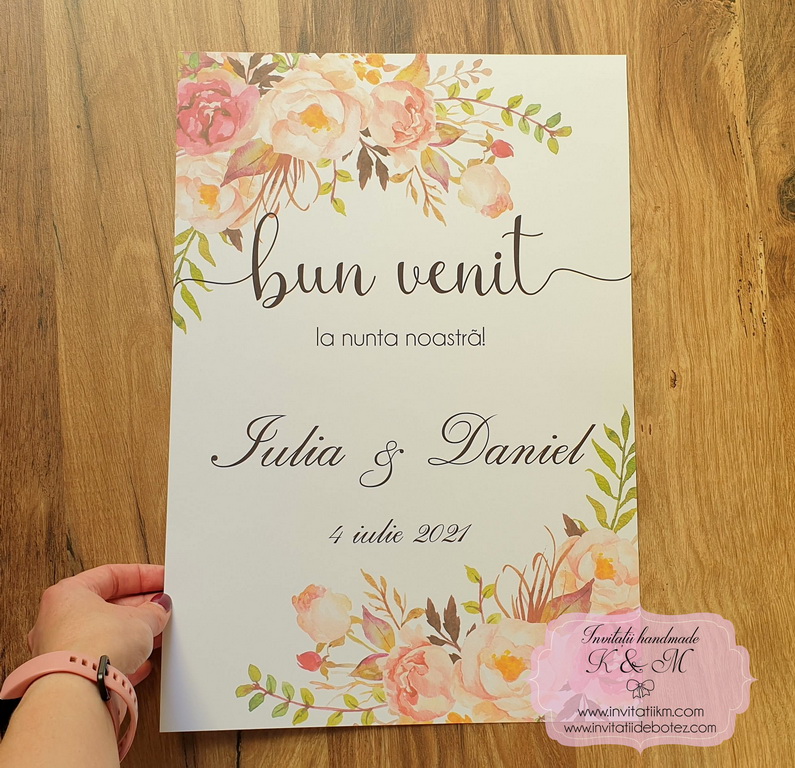 Panou de intampinare “Bine ati venit” cu flori in nuante de roz, piersica si somon