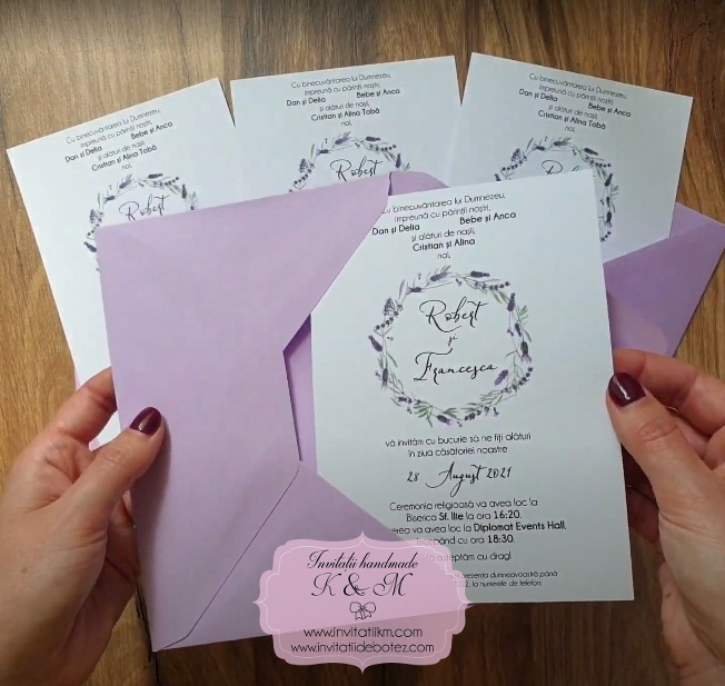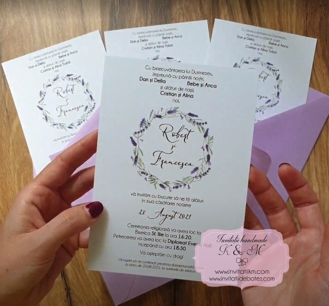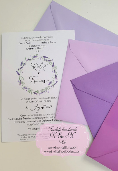 Invitatii de nunta cu coronita din lavanda si plicuri culoarea lavandei