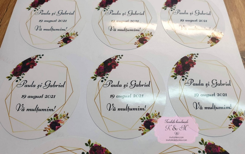Etichete autoadezive/stickere pentru marturii de nunta cu flori bordeaux/burgundy, realizate din autocolant lucios/mat