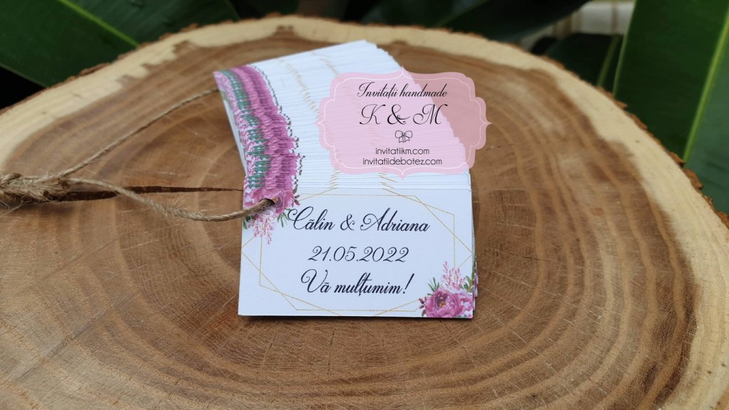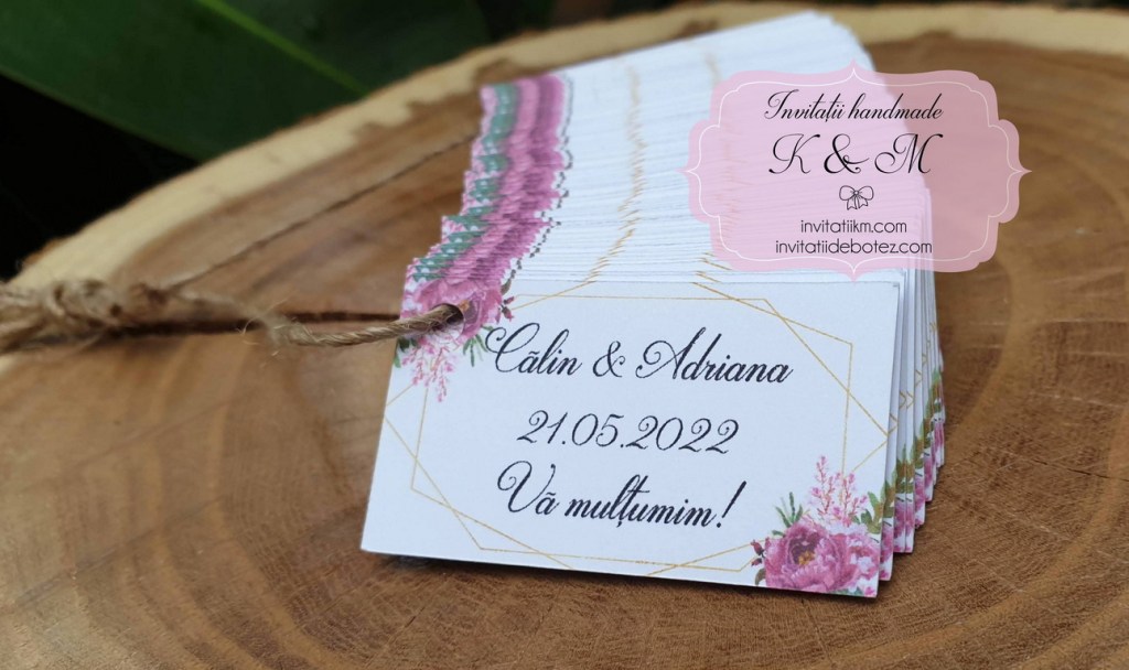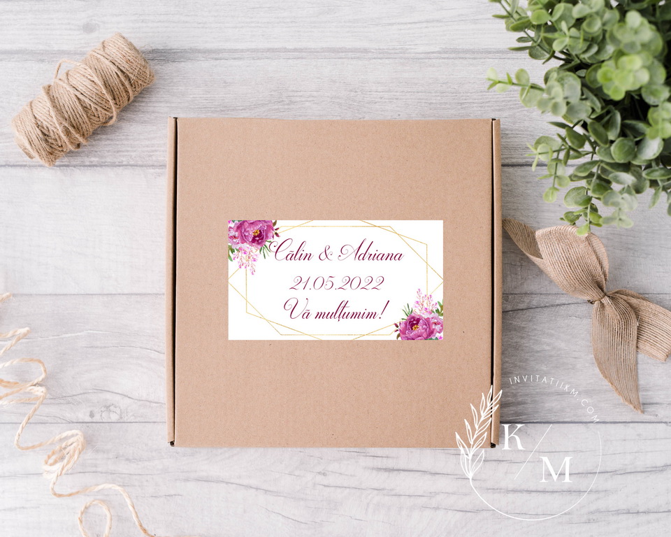 Etichete pentru marturii cu chenar geometric si bujori in nuante de roz