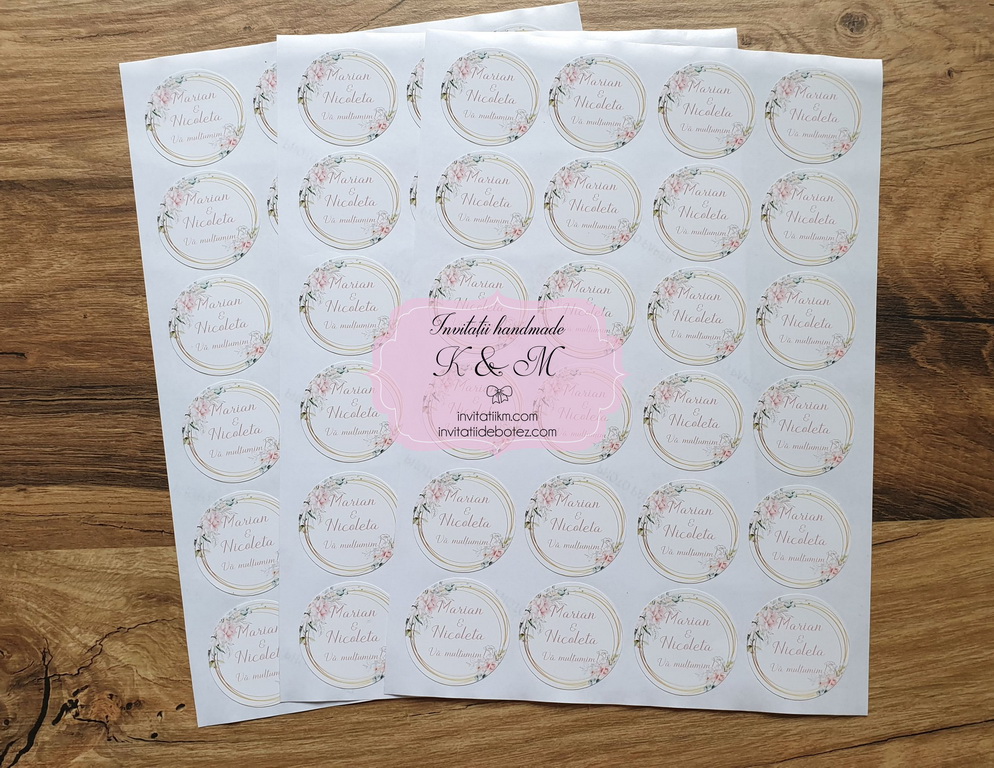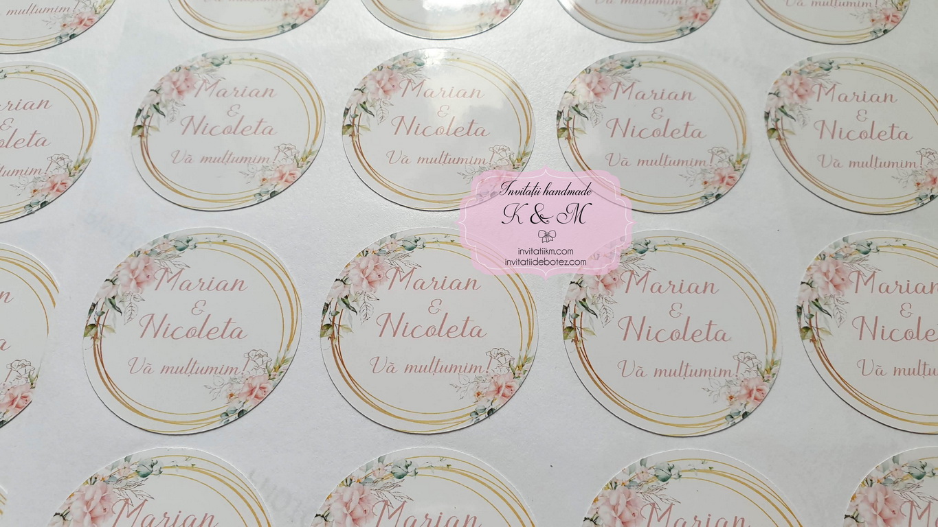 Etichete autoadezive/stickere pentru marturii de nunta cu flori piersica/somon/blush, realizate din autocolant lucios/mat