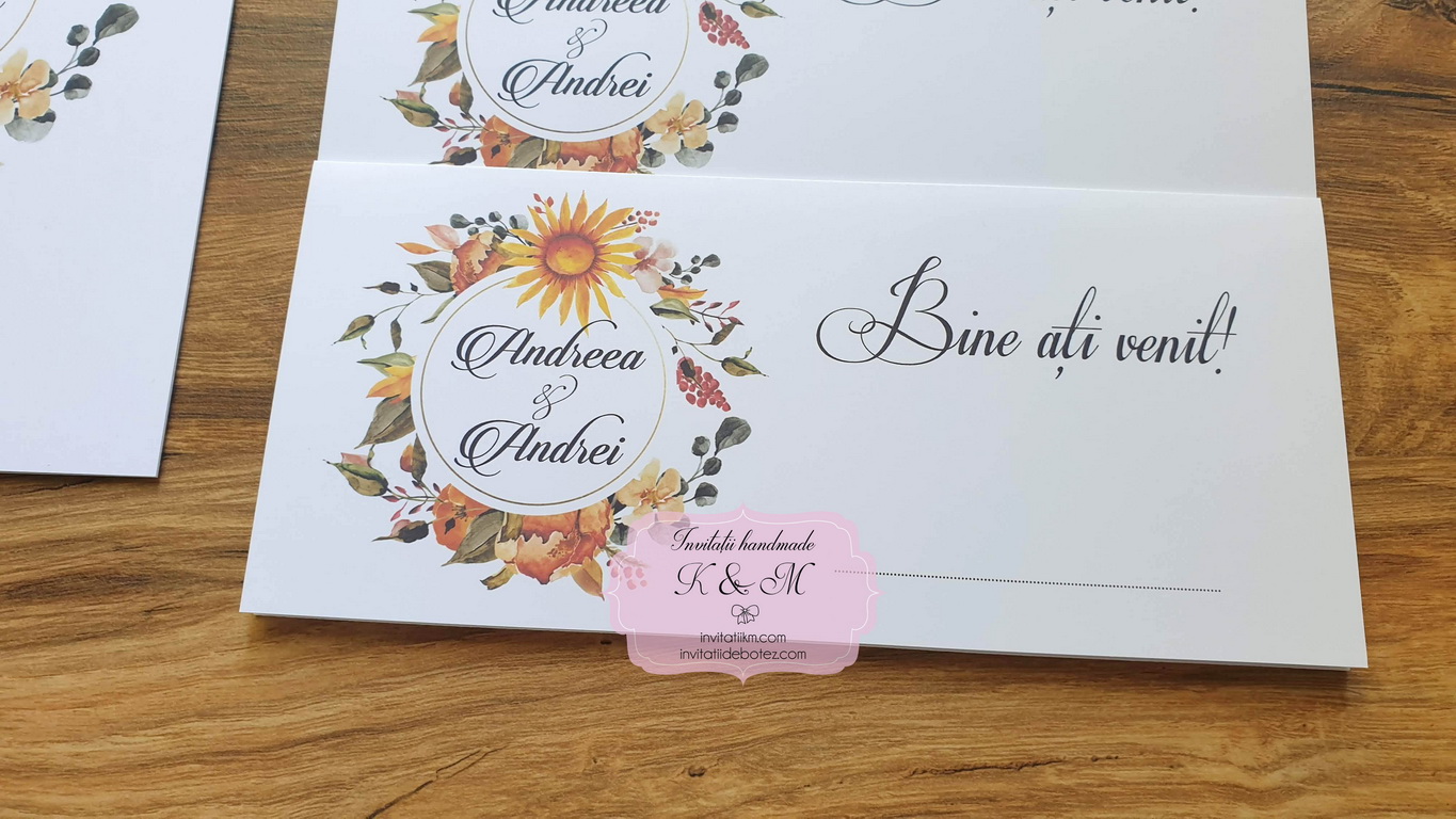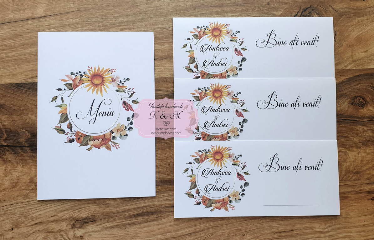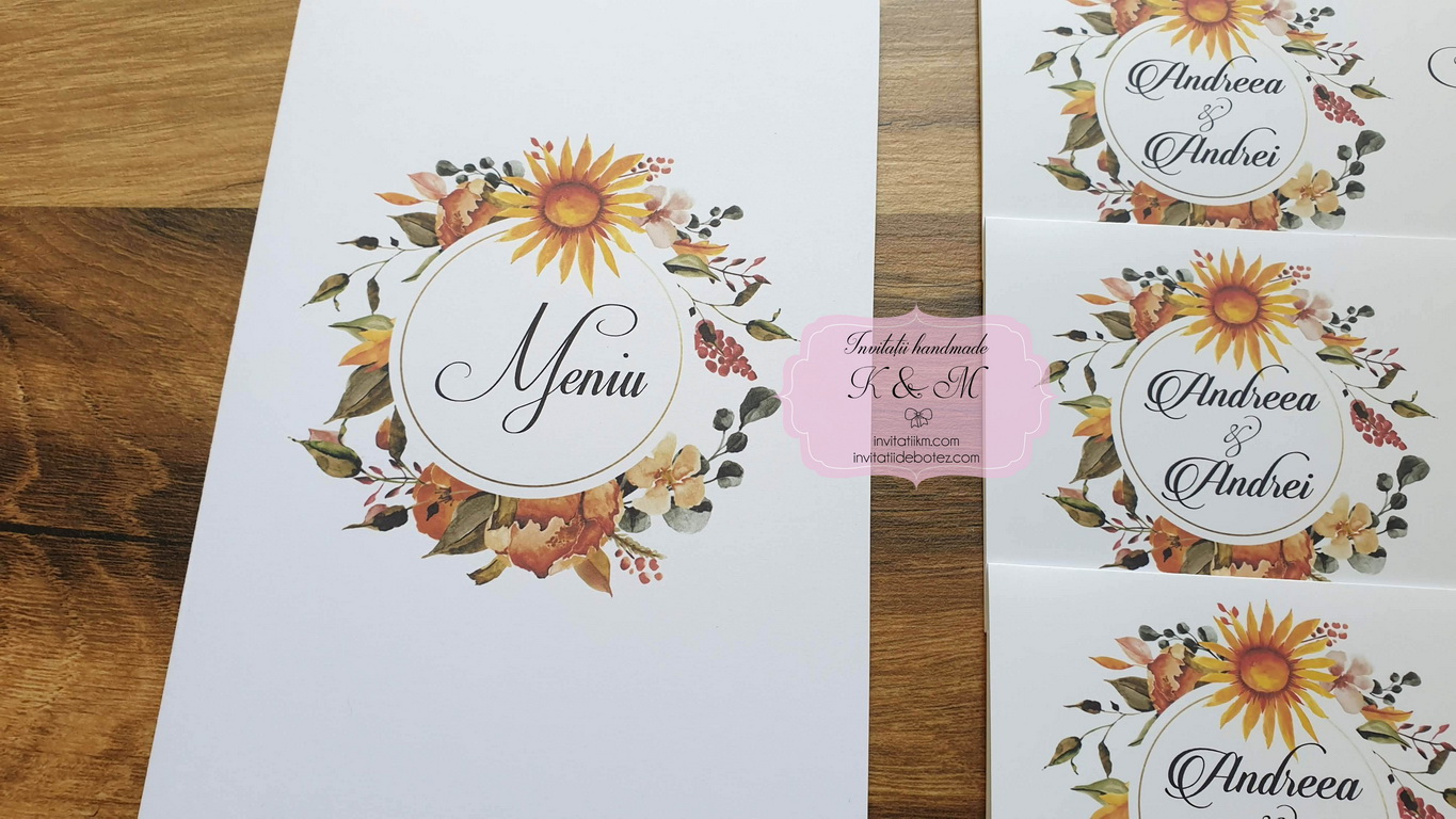 Meniuri si plicuri de bani/card de asezare cu coronita florala, in culori de toamna