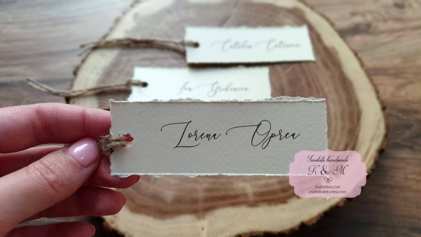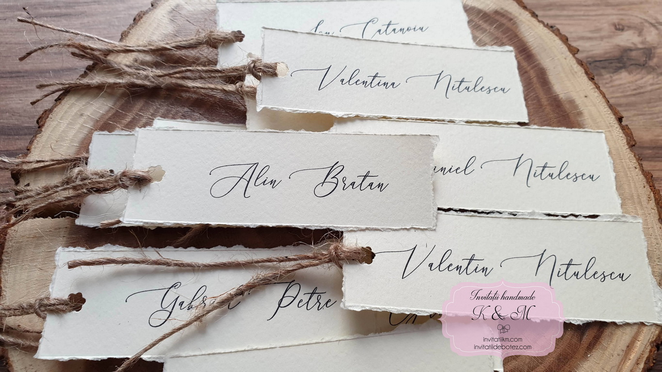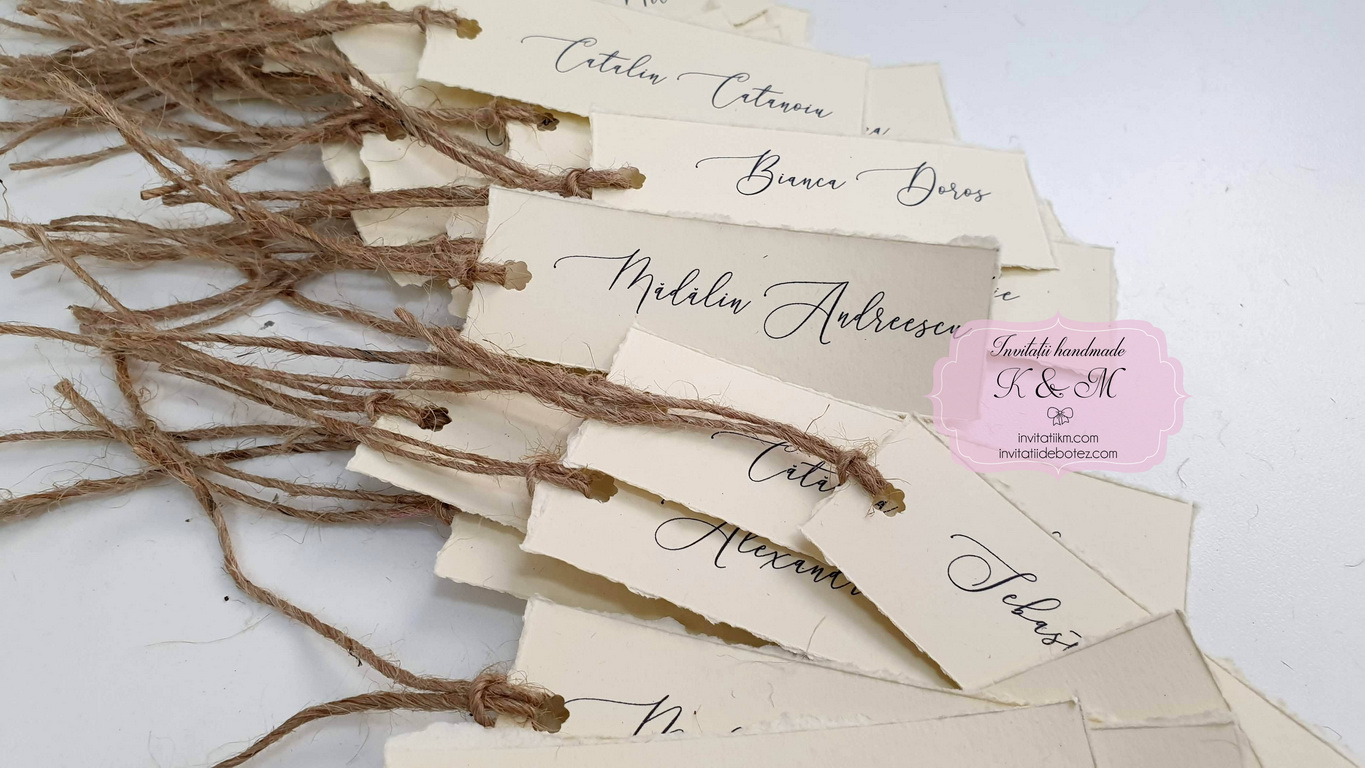 Carduri de asezare/place-card-uri cu numele fiecarui invitat, realizate din carton crem texturat cu marginile rupte manual, accesorizate cu sfoara