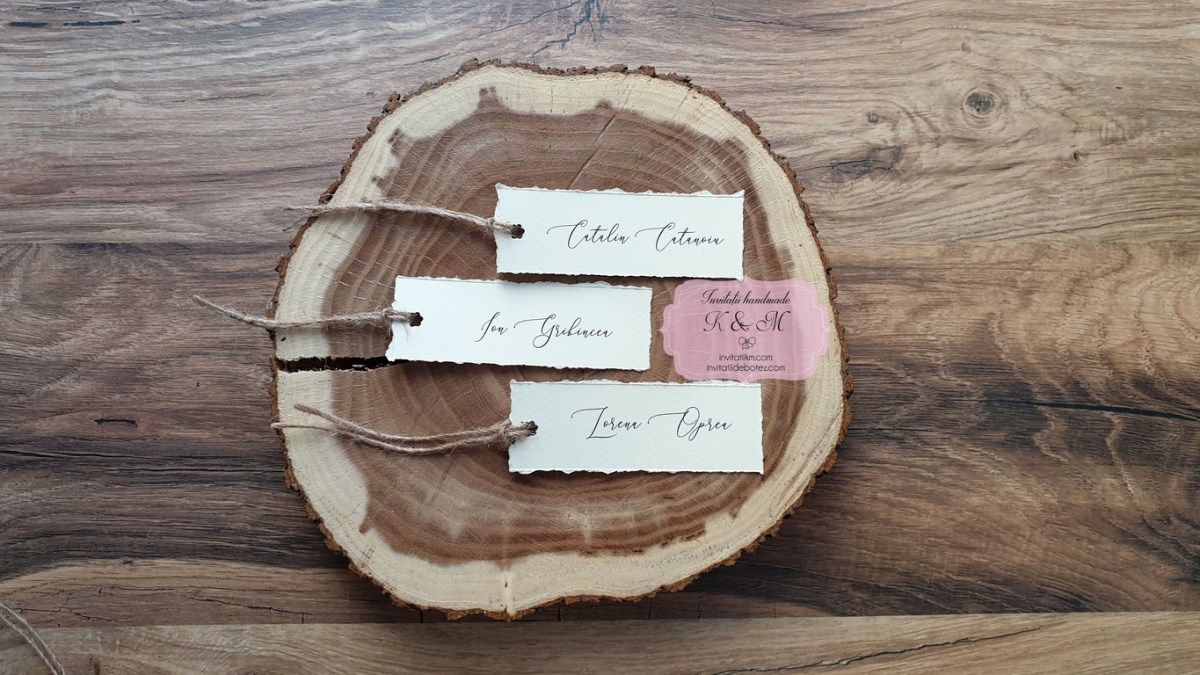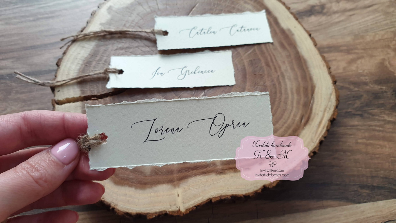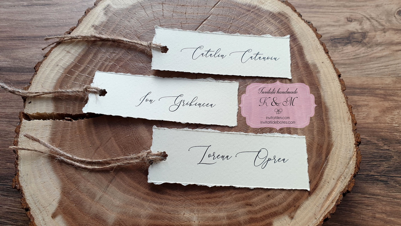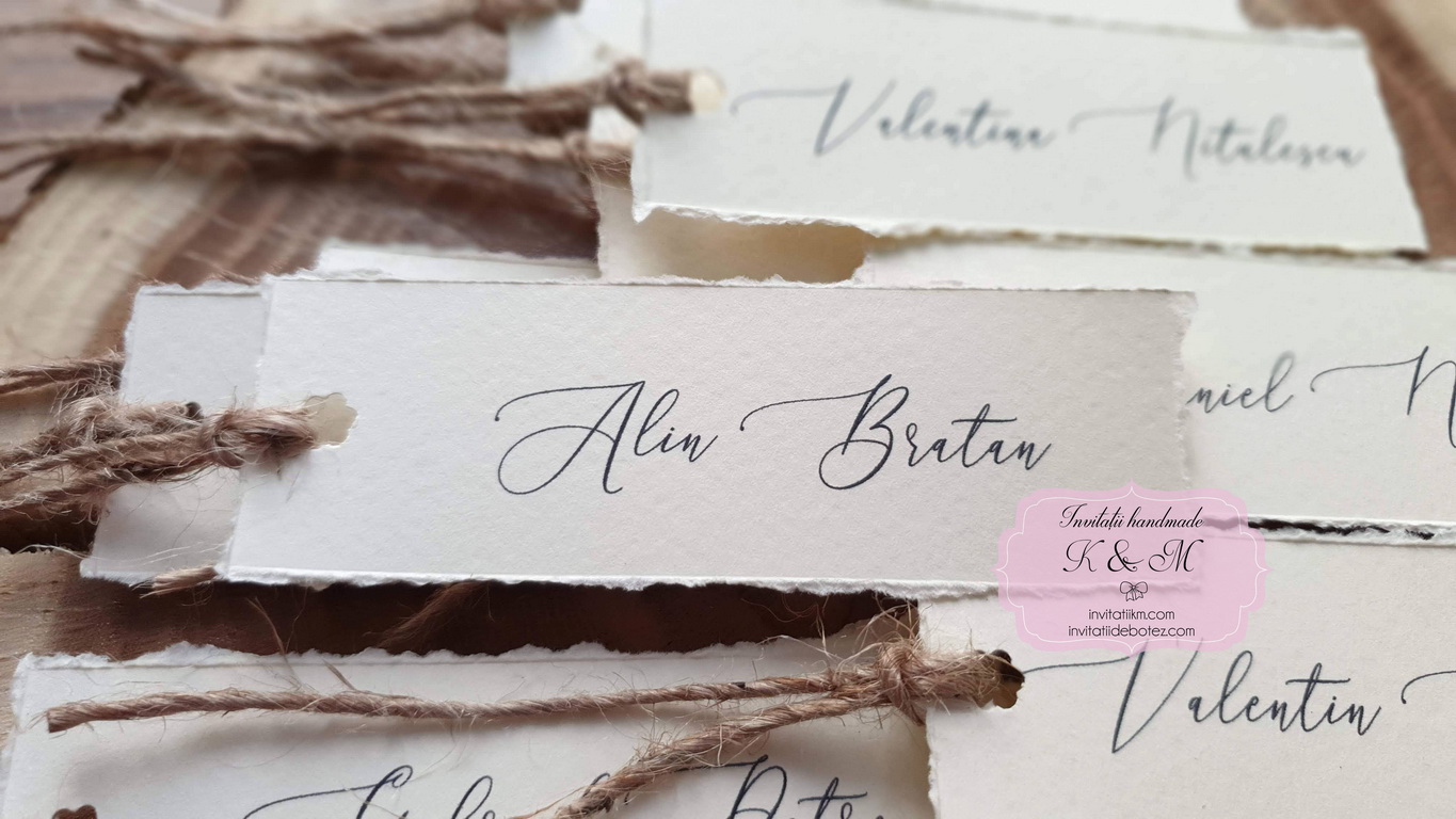 Carduri de asezare/place-card-uri cu numele fiecarui invitat, realizate din carton crem texturat cu marginile rupte manual, accesorizate cu sfoara