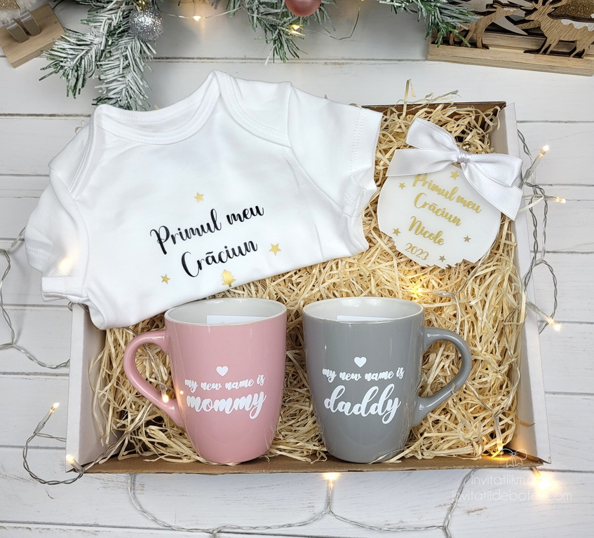 Set cadou pentru nou-nascut si tineri parinti, perfect pentru a sarbatori venirea pe lume a noului membru al familiei. Il veti primi ambalat in cutie + fundita asortata, gata de a-l oferi cadou si il putem expedia oriunde doriti, trebuie doar sa ne lasati adresa celui care il va primi. Textele se pot personaliza dupa preferinte. Canile albe cu design color nu mai sunt disponibile.