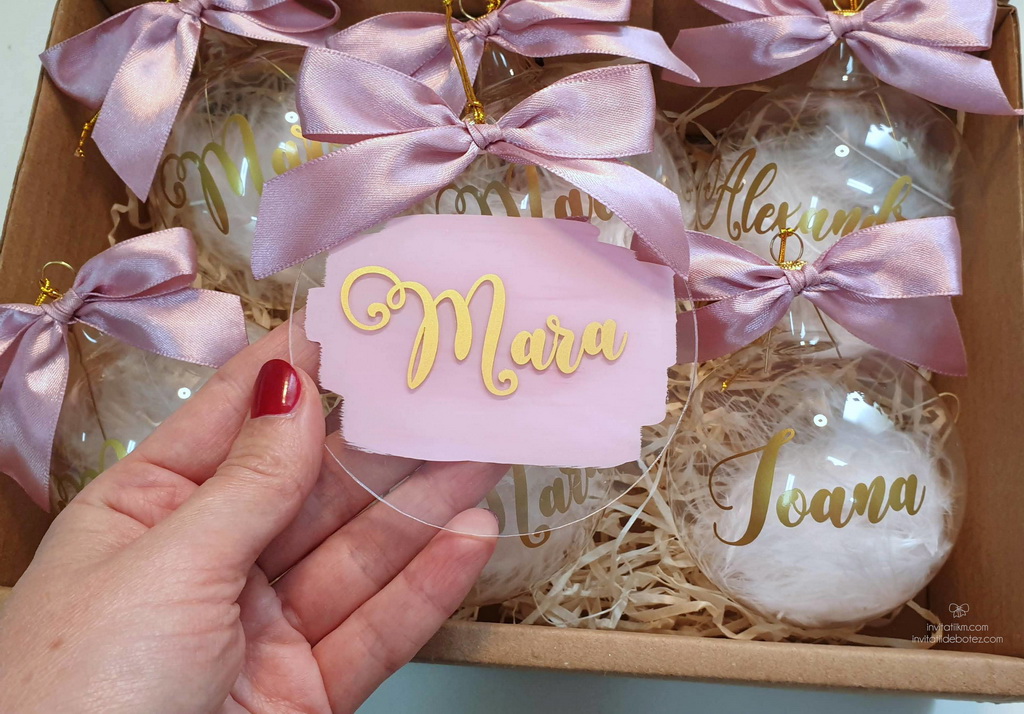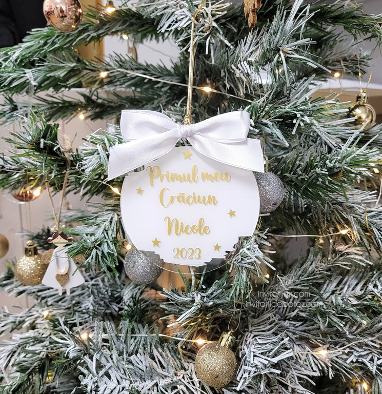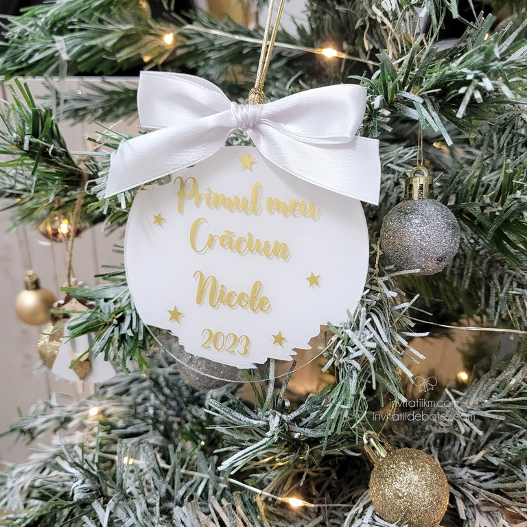 - un ornament de Craciun din plexiglas, fundita satinata si textul dorit, personalizat cu vinil auriu
