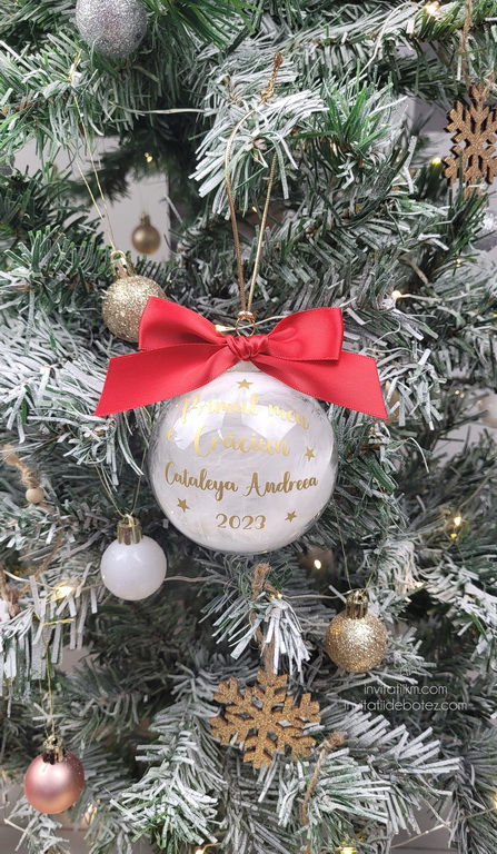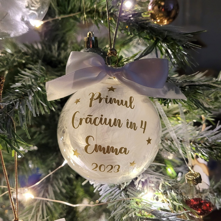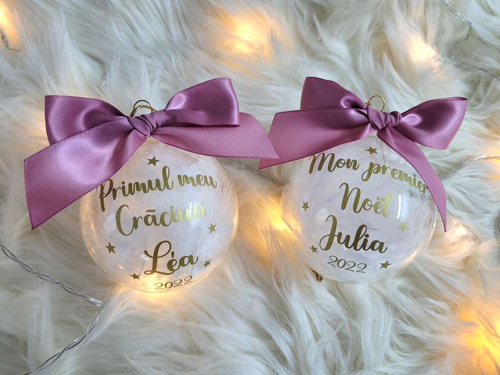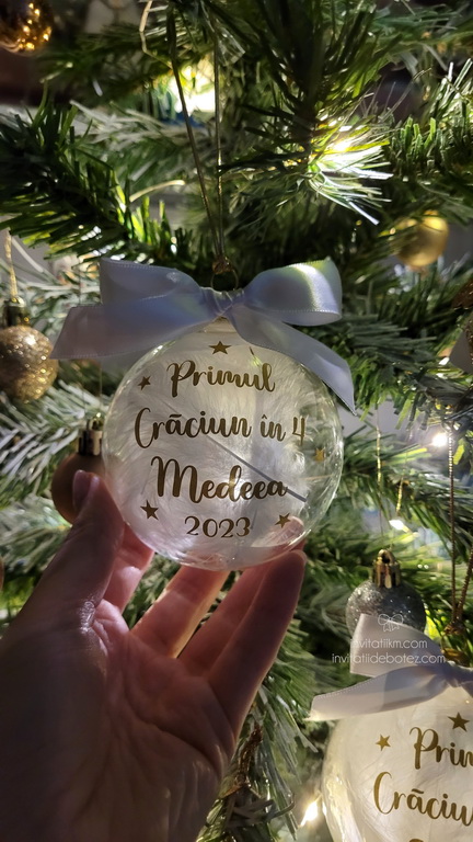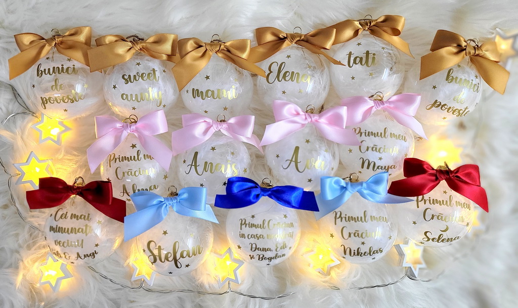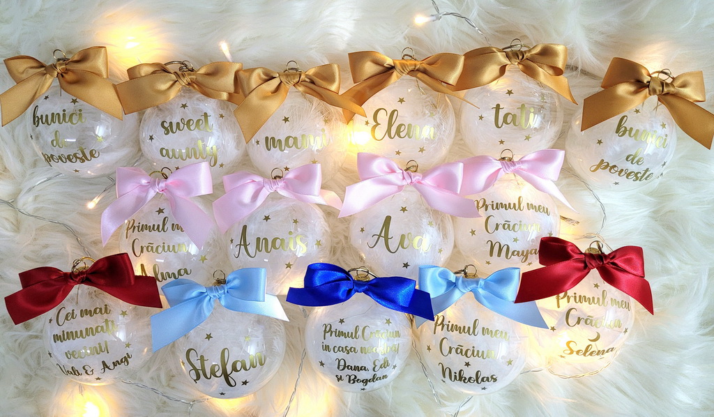 Globuri de Craciun personalizate cu nume sau cu diverse texte (Craciun fericit, Craciun magic, Primul Craciun impreuna, Primul Craciun in 2 etc).