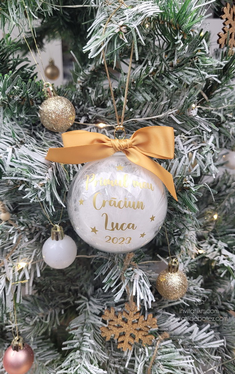 Textul este realizat din autocolant auriu, decupat si aplicat cu grija pe globul din sticla. Globurile sunt din sticla, rotunde, cu diametru de 8 cm, umplute cu pene si vor fi livrate in ambalaj individual. Funditele sunt realizate din panglica satinata, atent lucrate, astfel incat capetele nu se desira. Fiind lucrate manual, pot exista mici diferente intre produse.