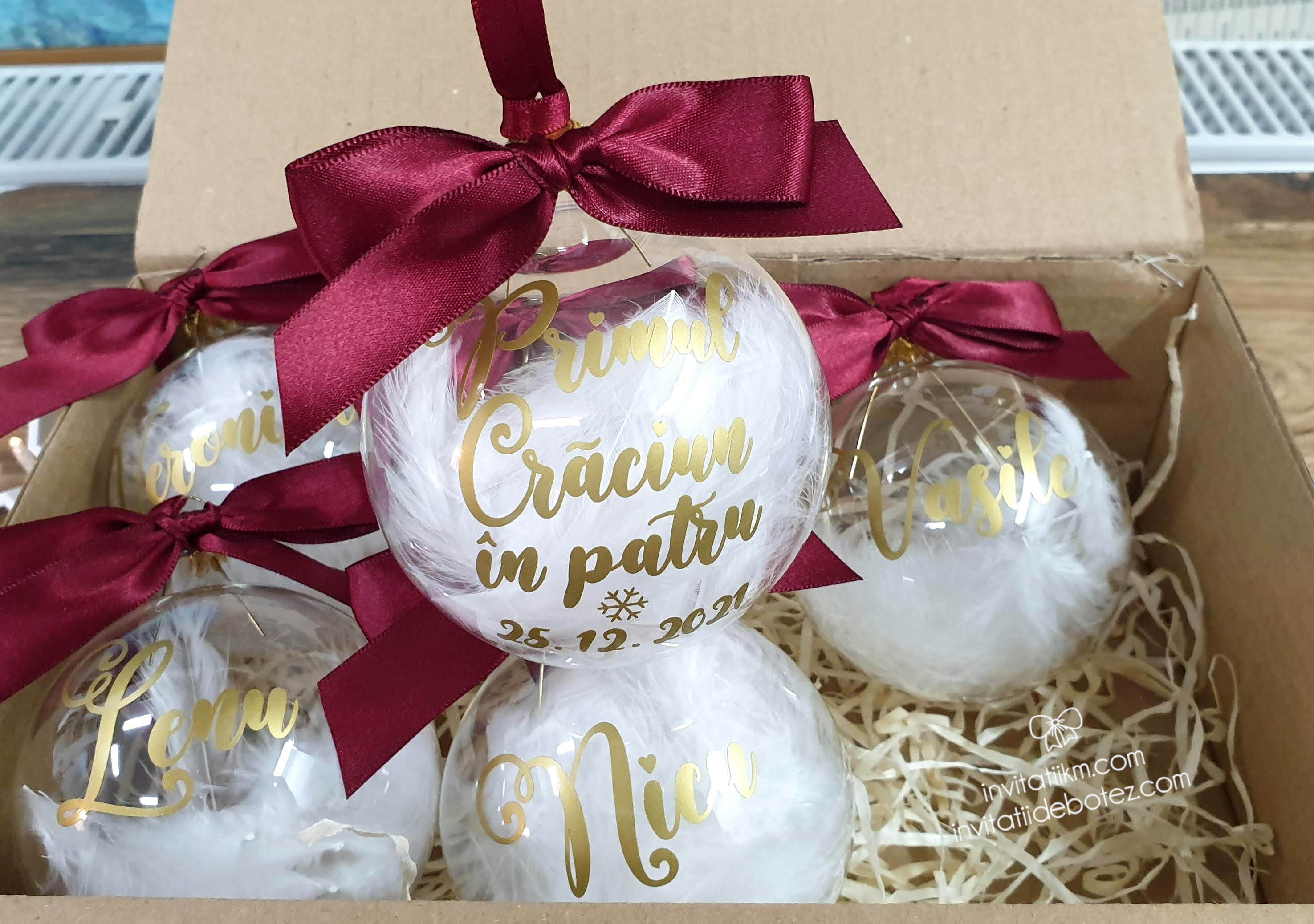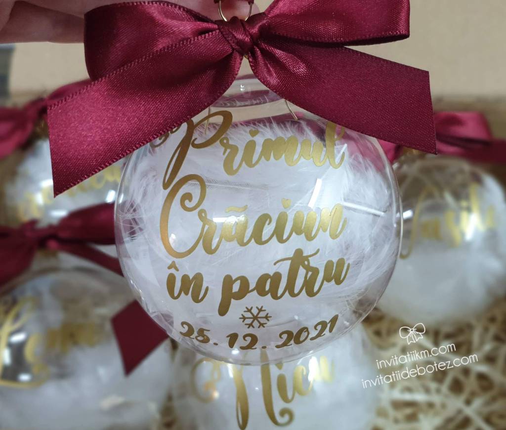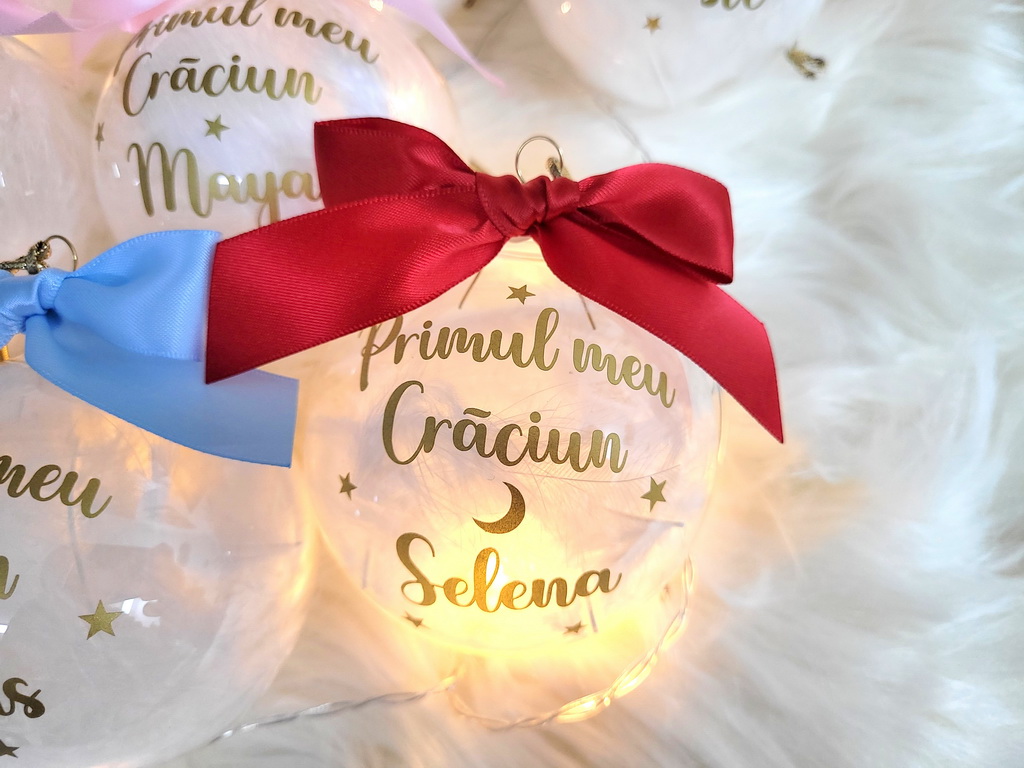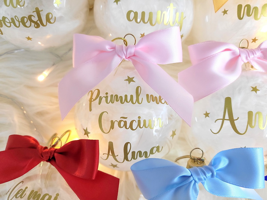 Globuri de Craciun personalizate cu nume sau cu diverse texte (Craciun fericit, Craciun magic, Primul Craciun impreuna, Primul Craciun in 2 etc).