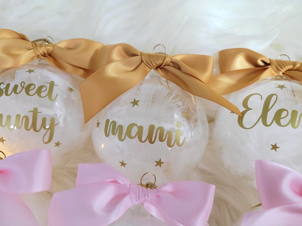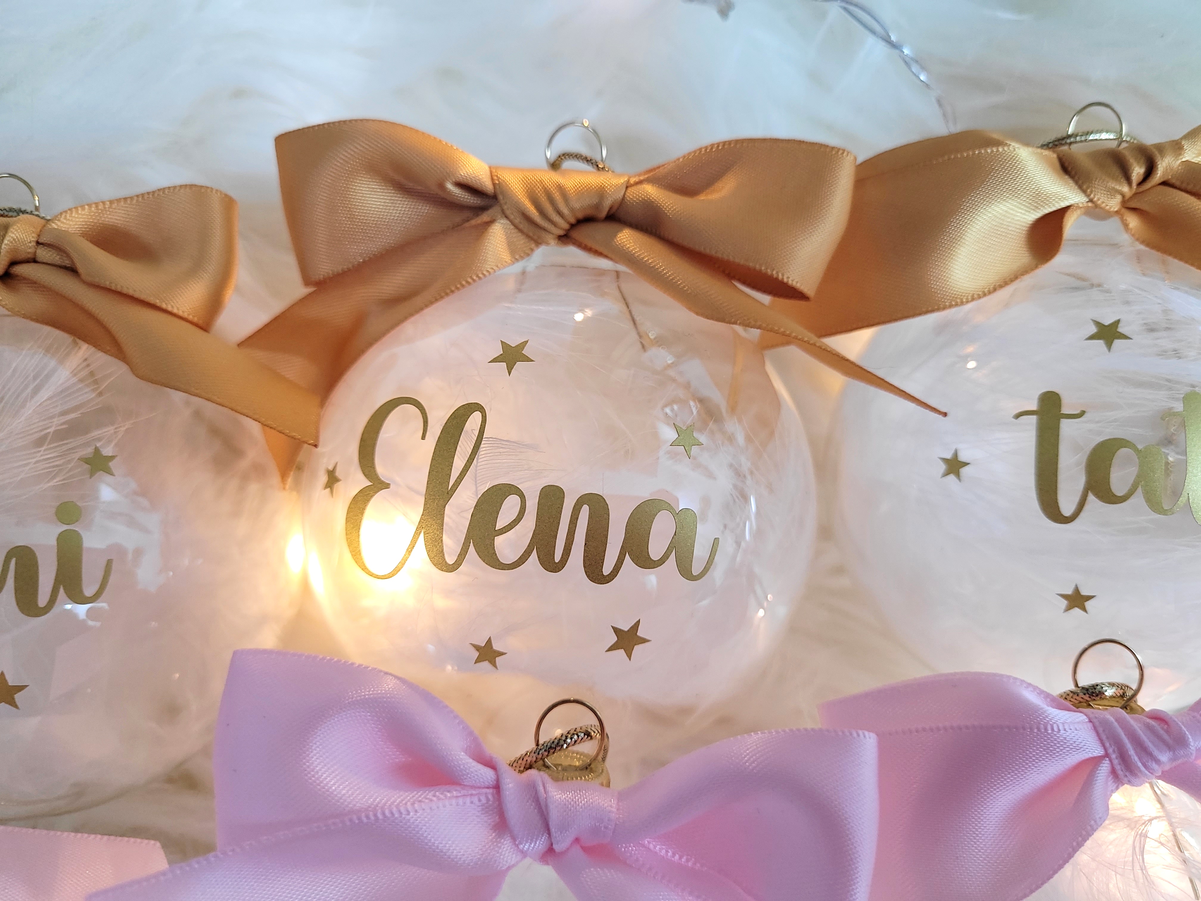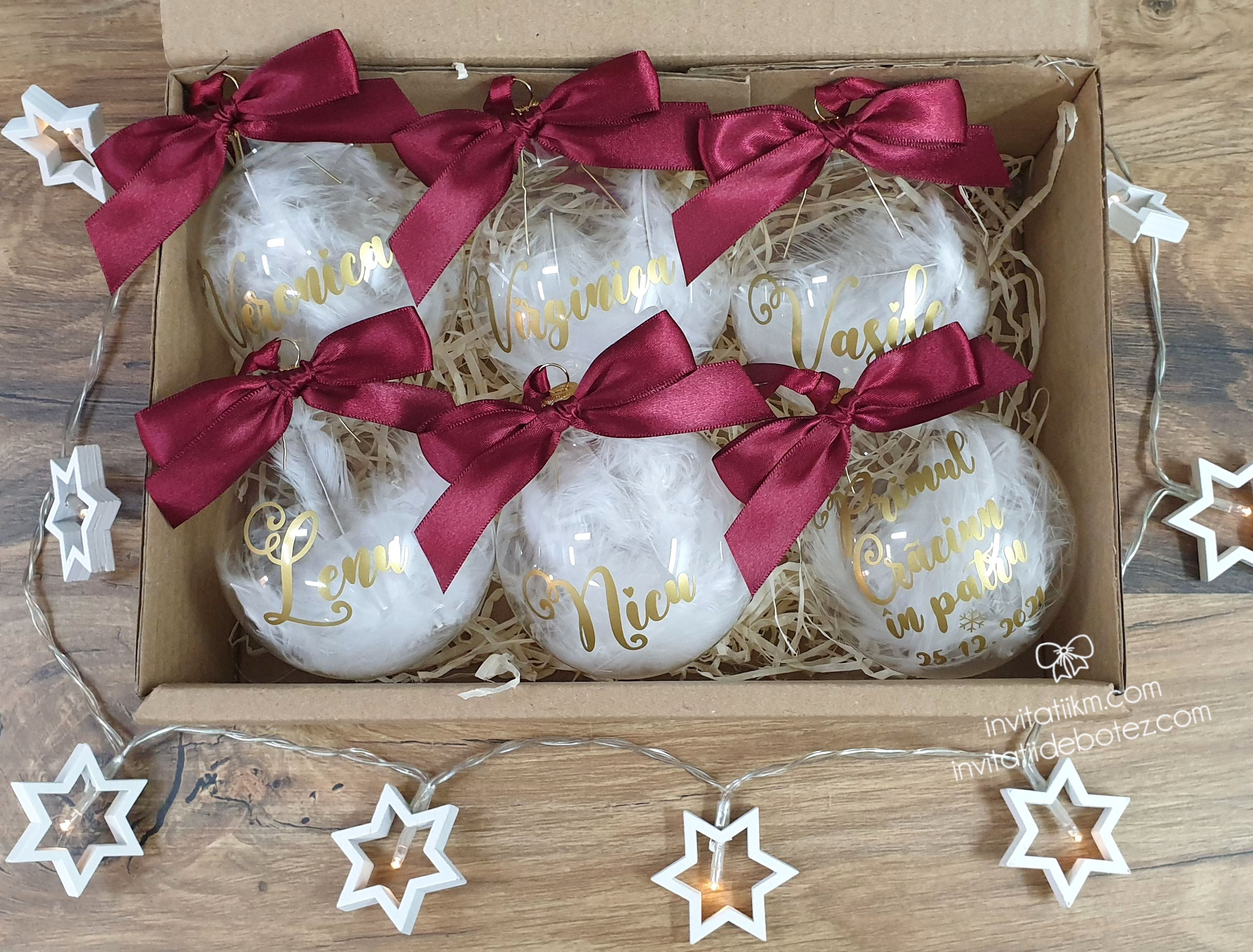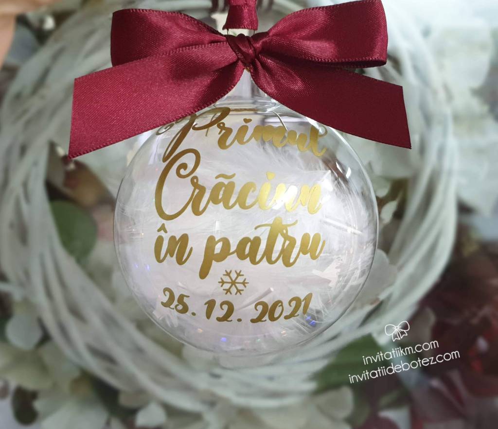 Globuri de Craciun personalizate cu nume sau cu diverse texte (Craciun fericit, Craciun magic, Primul Craciun impreuna, Primul Craciun in 2 etc).