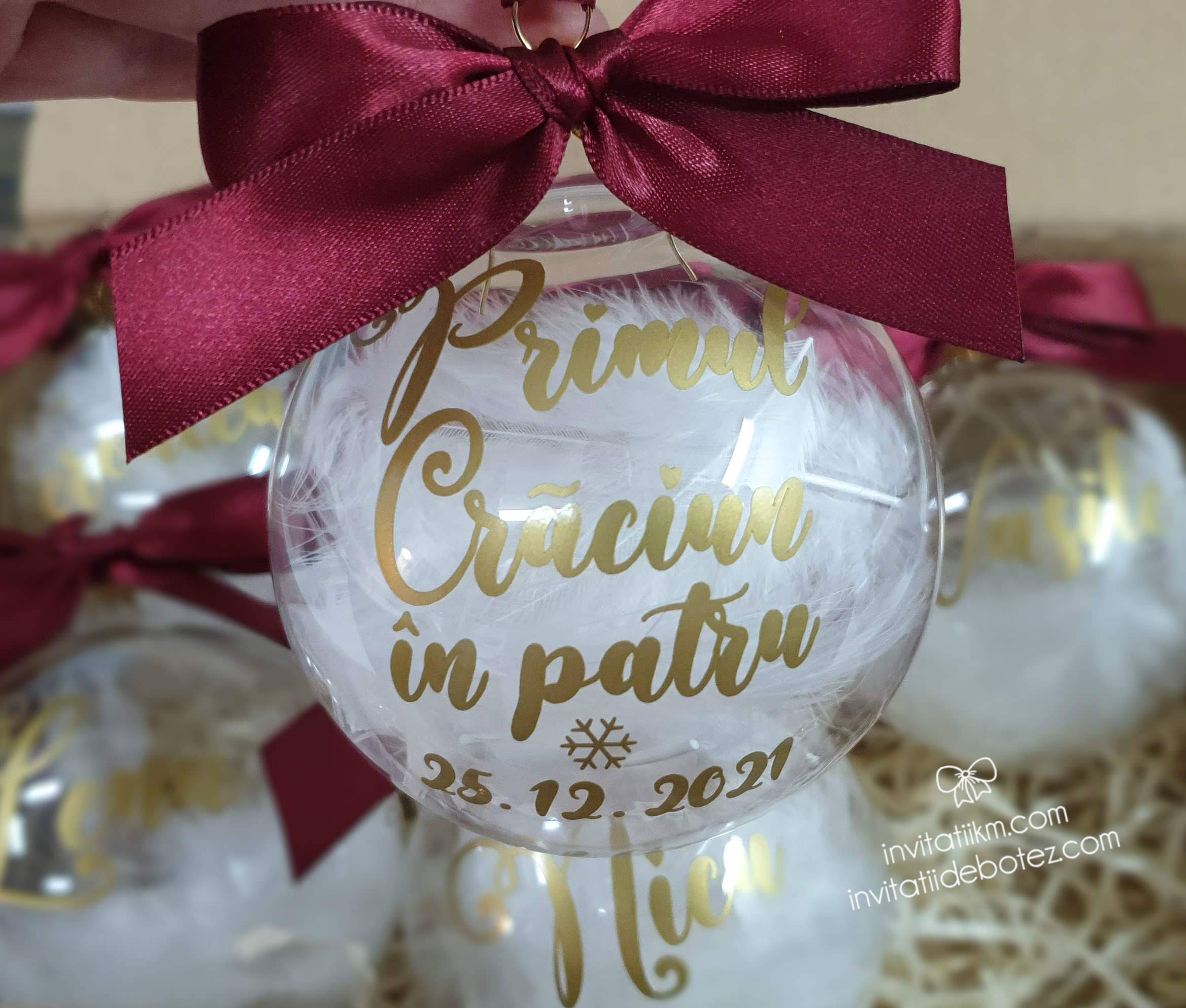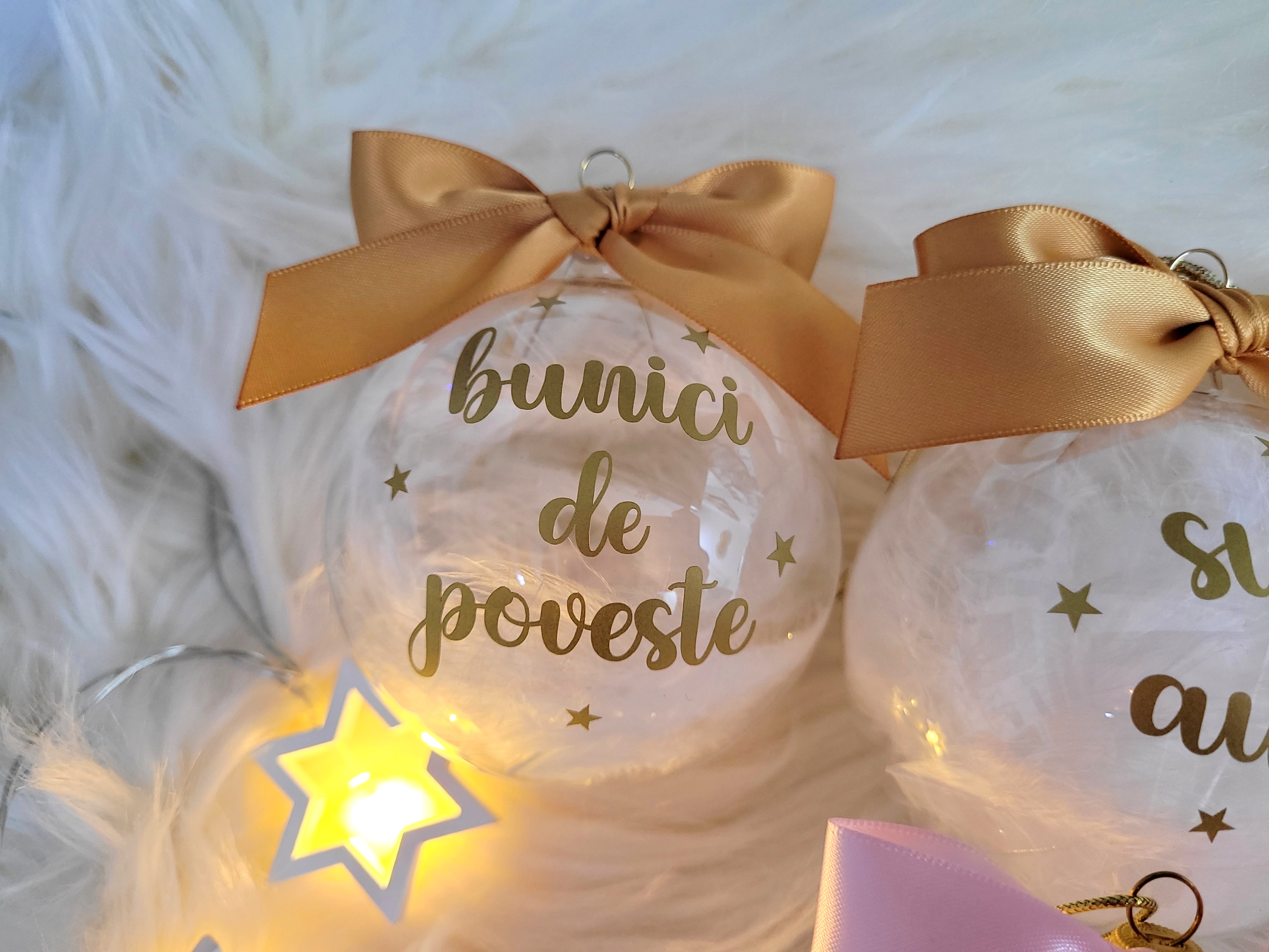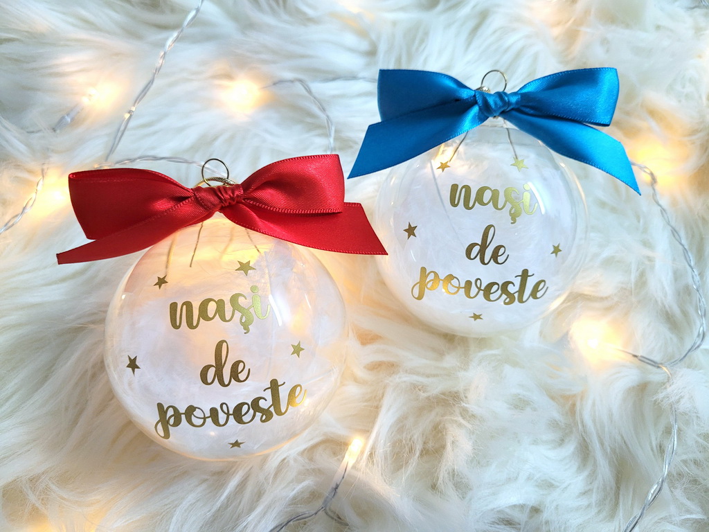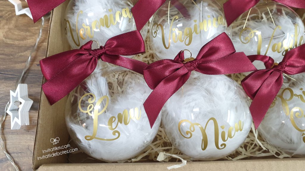 Textul este realizat din autocolant auriu, decupat si aplicat cu grija pe globul din sticla. Globurile sunt din sticla, rotunde, cu diametru de 8 cm, umplute cu pene si vor fi livrate in ambalaj individual. Funditele sunt realizate din panglica satinata, atent lucrate, astfel incat capetele nu se desira. Fiind lucrate manual, pot exista mici diferente intre produse.