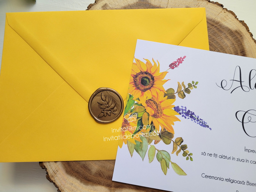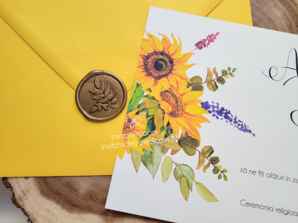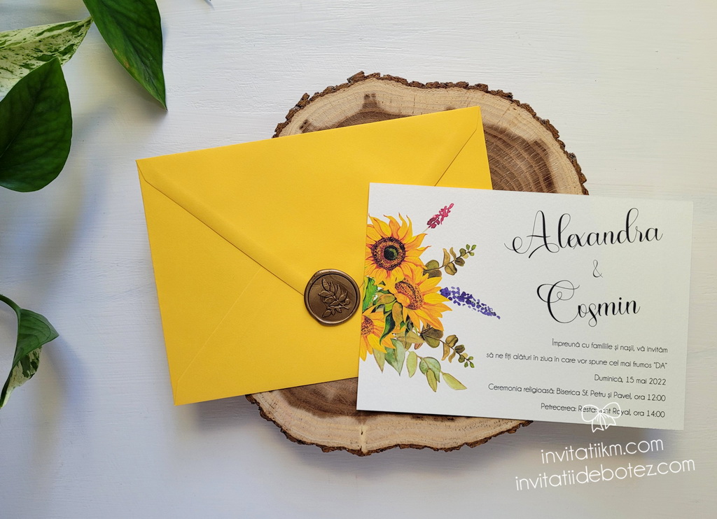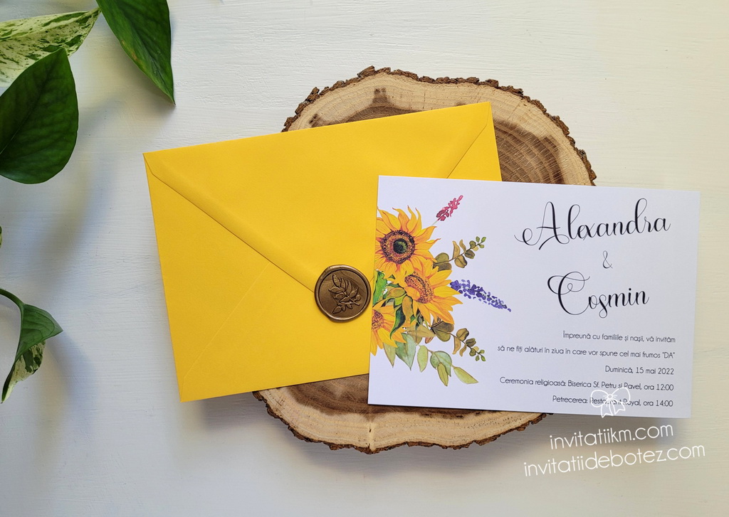Invitatii de nunta minimaliste si de efect, realizate din carton alb sau ivory, cu text simplu, floarea-soarelui de un galben aprins si un fir de lavanda, accesorizate cu un plic in acelasi ton.