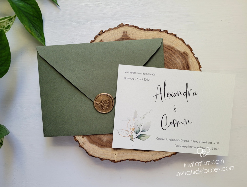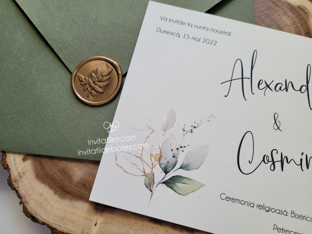Invitatii de nunta minimaliste si de efect, realizate din carton alb sau ivory, cu text simplu si frunzulite verzi si aurii, accesorizate cu un plic in acelasi ton.