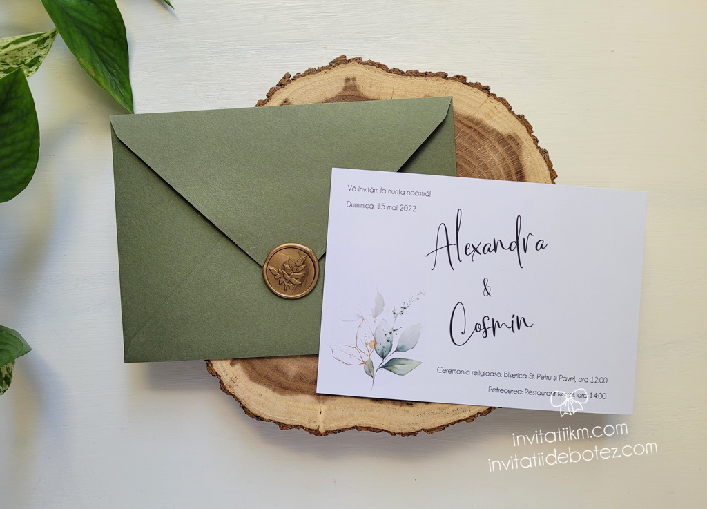 In imagini: invitatii din carton alb neted si ivory texturat + sigiliu + plic handmade verde olive