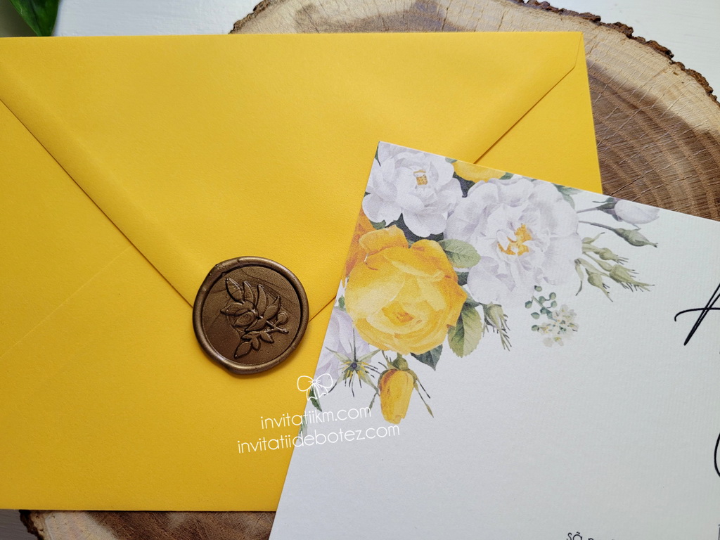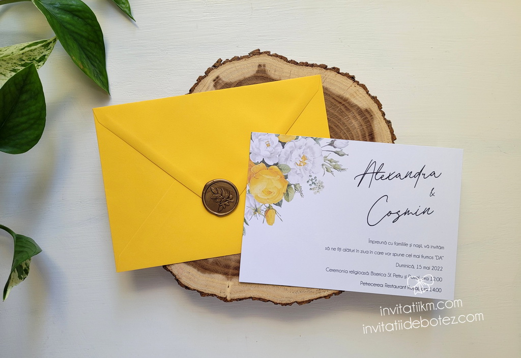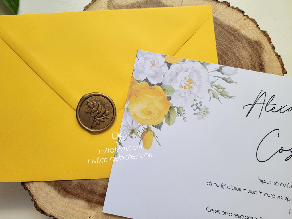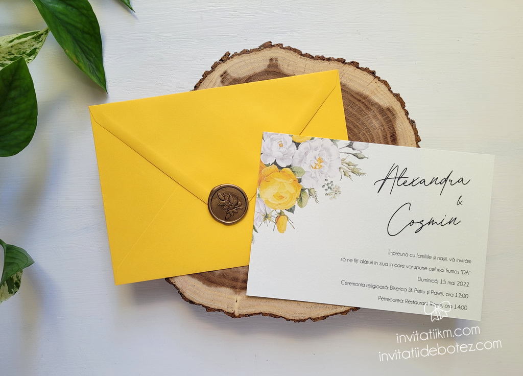In imagini: invitatii din carton alb neted si ivory texturat + sigiliu + plic simplu galben