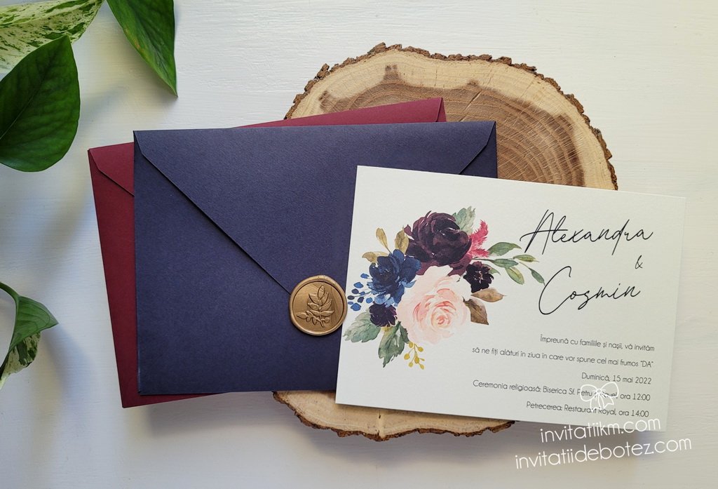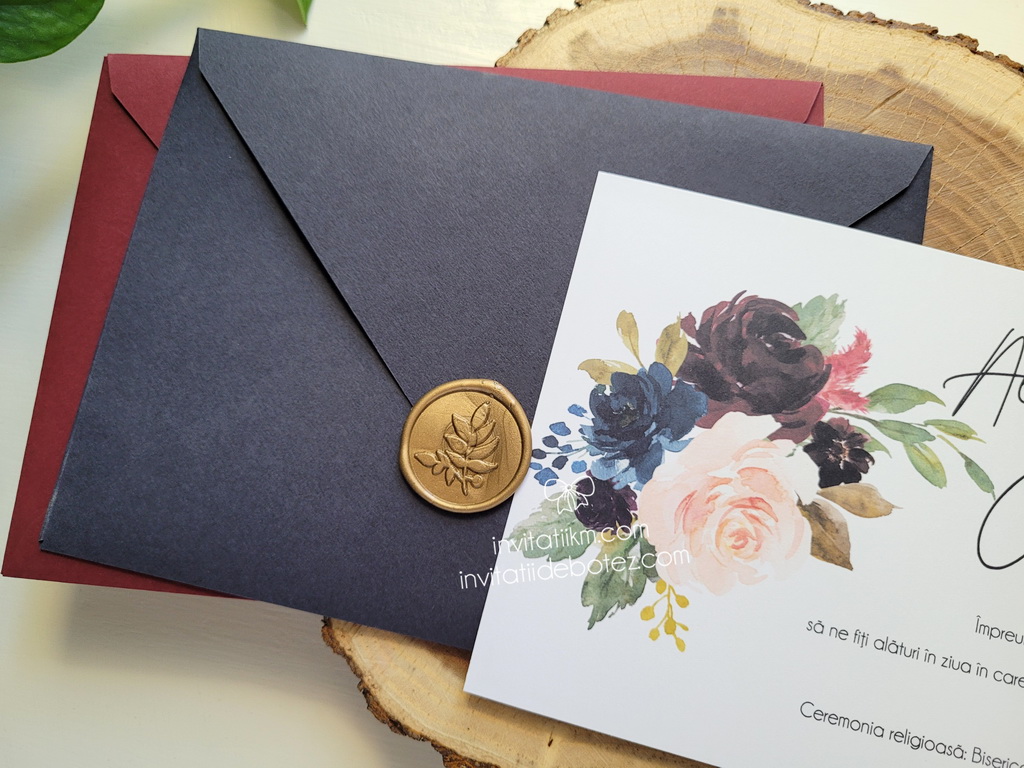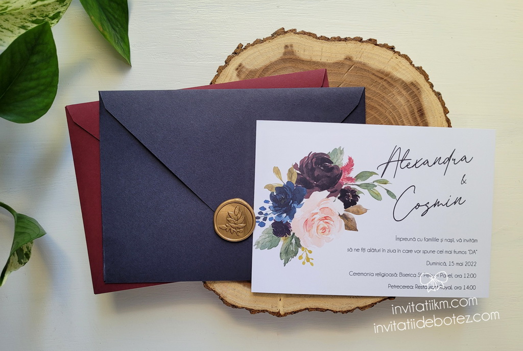 Invitatii de nunta minimaliste si de efect, realizate din carton alb sau ivory, cu text simplu, buchet de flori in nuante de bleumarin, piersica, grena, bordeaux, accesorizate cu un plic in acelasi ton.