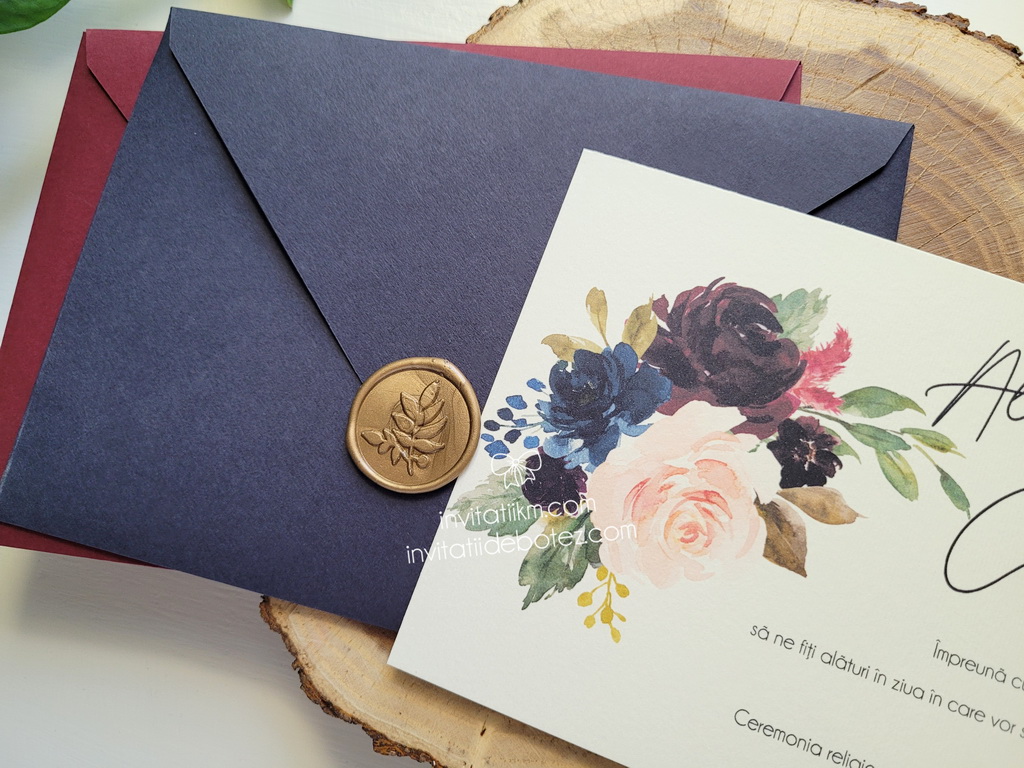 In imagini: invitatii din carton alb neted si ivory texturat + sigiliu + plic handmade bleumarin sau bordeaux