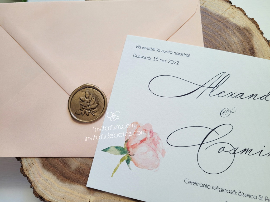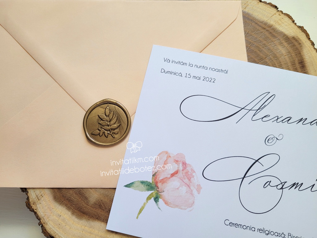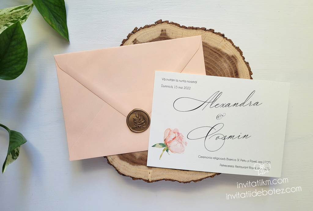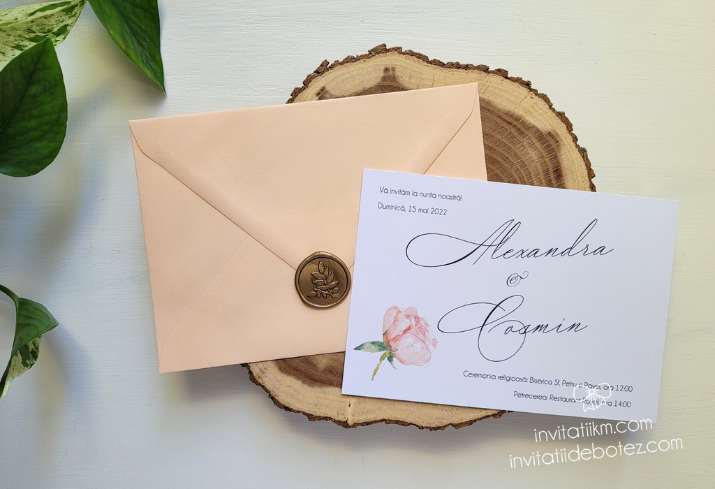 Invitatii de nunta minimaliste si de efect, realizate din carton alb sau ivory, cu text simplu si un boboc de floare in nuante de roz-piersica, accesorizate cu un plic in acelasi ton.