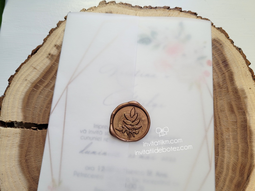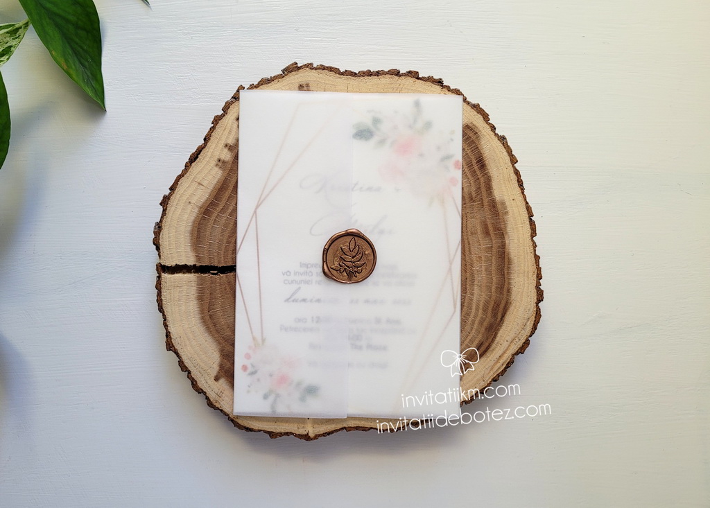Invitatii de nunta realizate din carton ivory texturat, chenar geometric auriu, buchete de flori in nuante pastelate, invelis din hartie translucida/hartie de calc si sigiliu asortat
