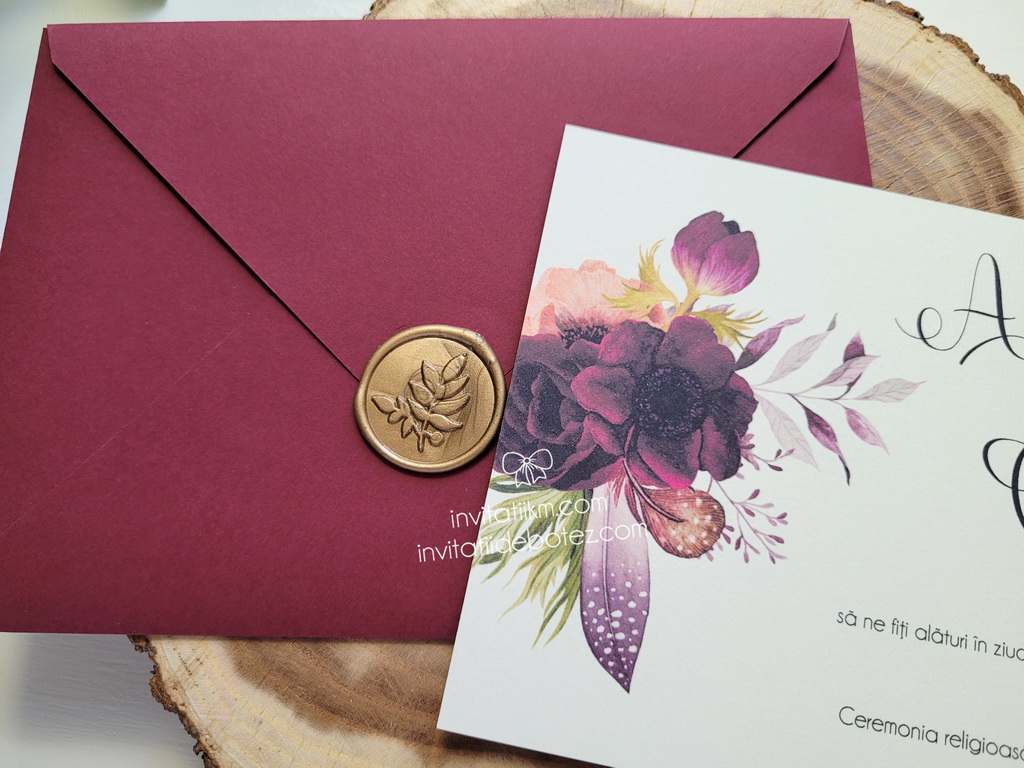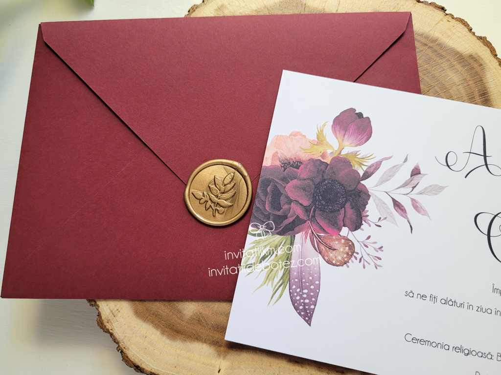 Invitatii de nunta minimaliste si de efect, realizate din carton alb sau ivory, cu text simplu, buchet de flori in stil boho cu pene si flori bordeaux, accesorizate cu un plic in acelasi ton.