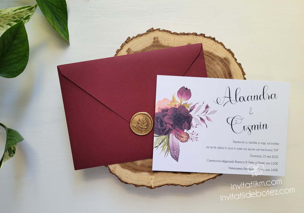 In imagini: invitatii din carton alb neted si ivory texturat + sigiliu + plic handmade bordeaux
