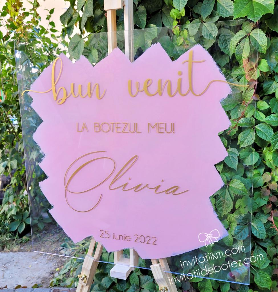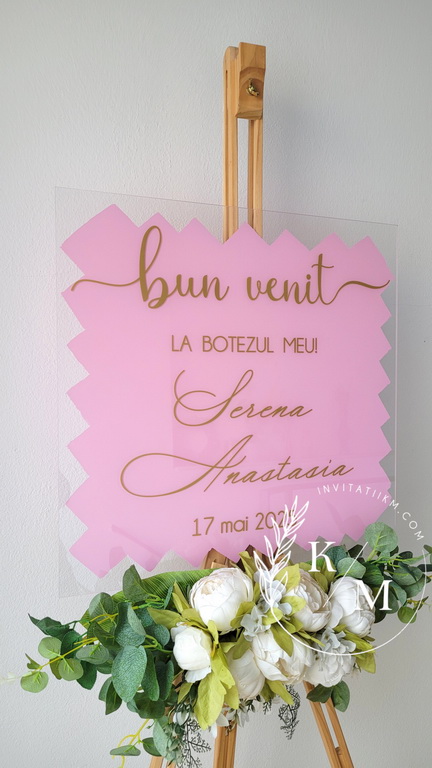 Panou de intampinare a invitatilor pentru nunta sau botez, realizat din plexiglas transparent, personalizat cu text din autocolant auriu si vopsit in diverse culori. Mai multe produse pentru botez aici: https://invitatiidebotez.com/