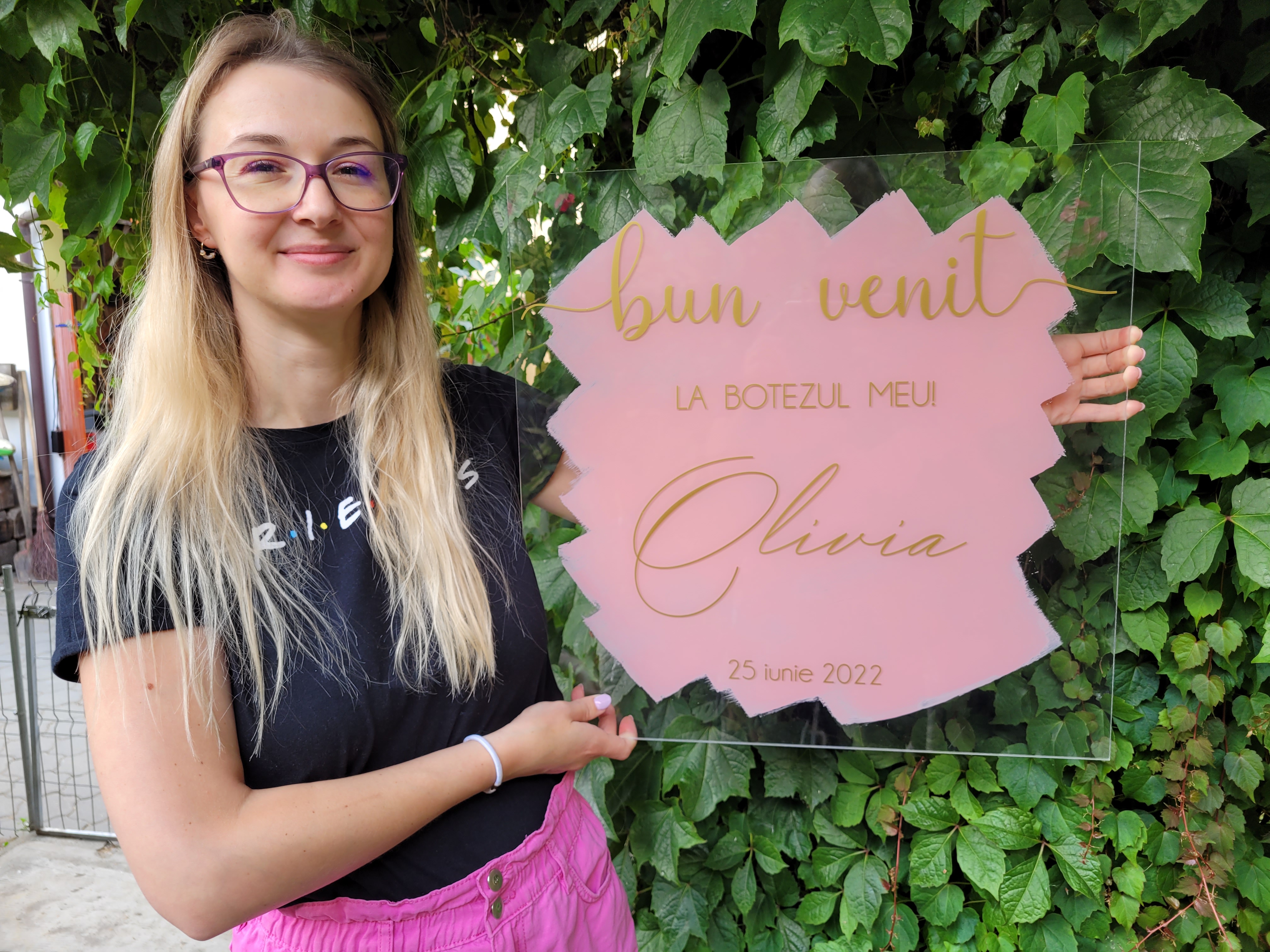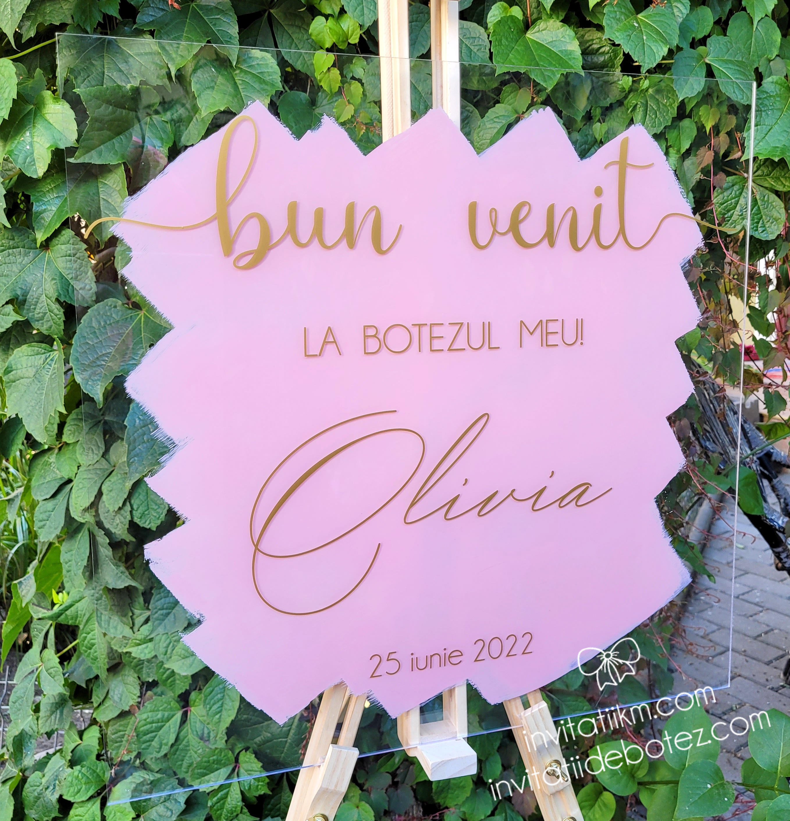 Panou de intampinare a invitatilor pentru nunta sau botez, realizat din plexiglas transparent, personalizat cu text din autocolant auriu si vopsit in diverse culori. Mai multe produse pentru botez aici: https://invitatiidebotez.com/
