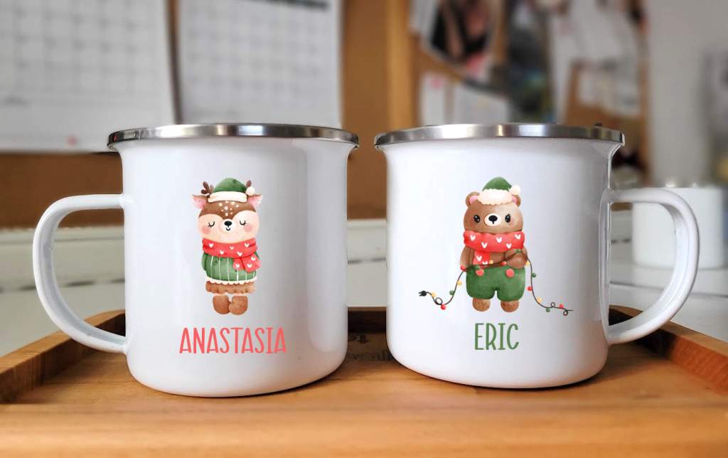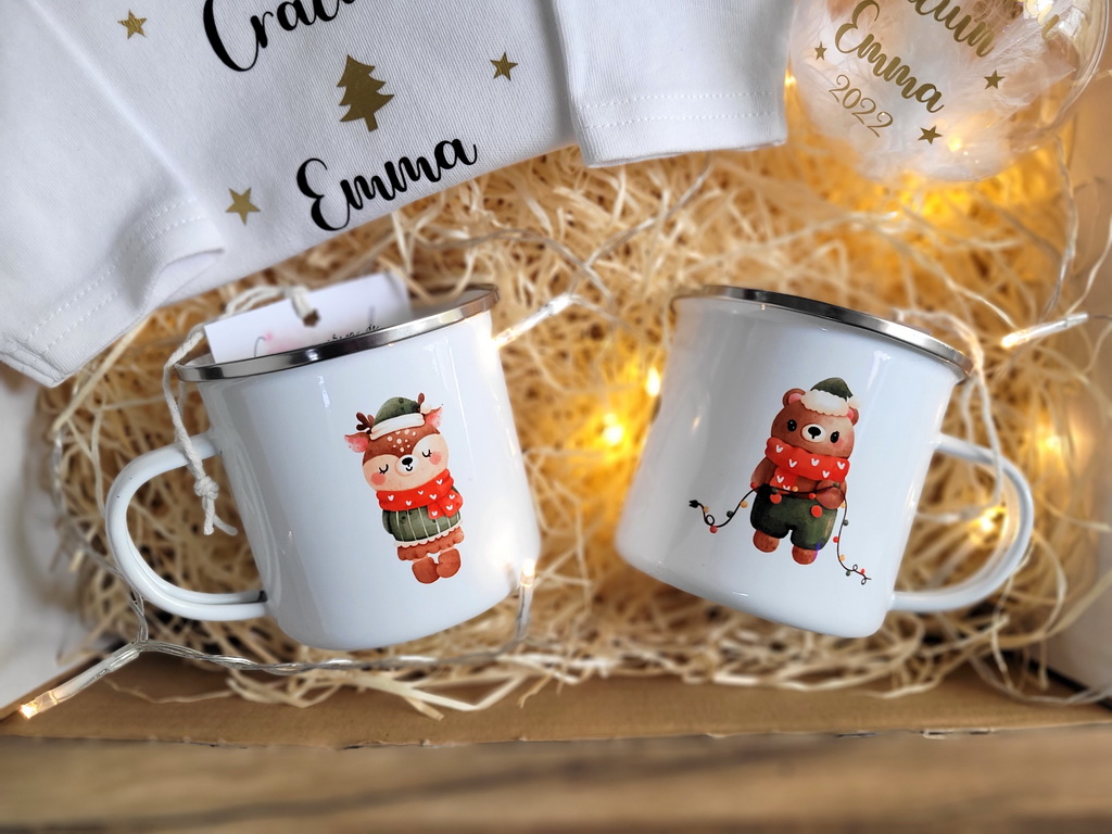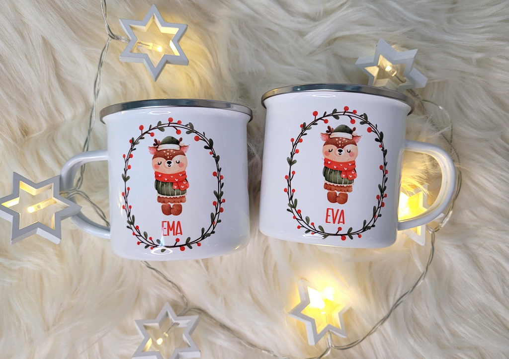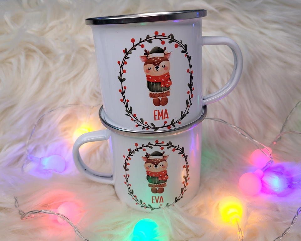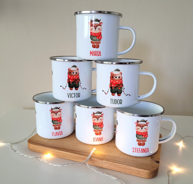 Cadouri de Craciun personalizate. Cana emailata personalizata de Craciun, cu numele copilului si un desen simpatic de Craciun. Cadoul potrivit pentru Mos Nicolae sau de pus sub brad in ziua de Craciun. Cana este realizata din otel alb emailat, rezistent la lovituri, cu design personalizat fata-verso, 360 ml. Fiind lucrate manual, pot exista mici diferente intre produse.