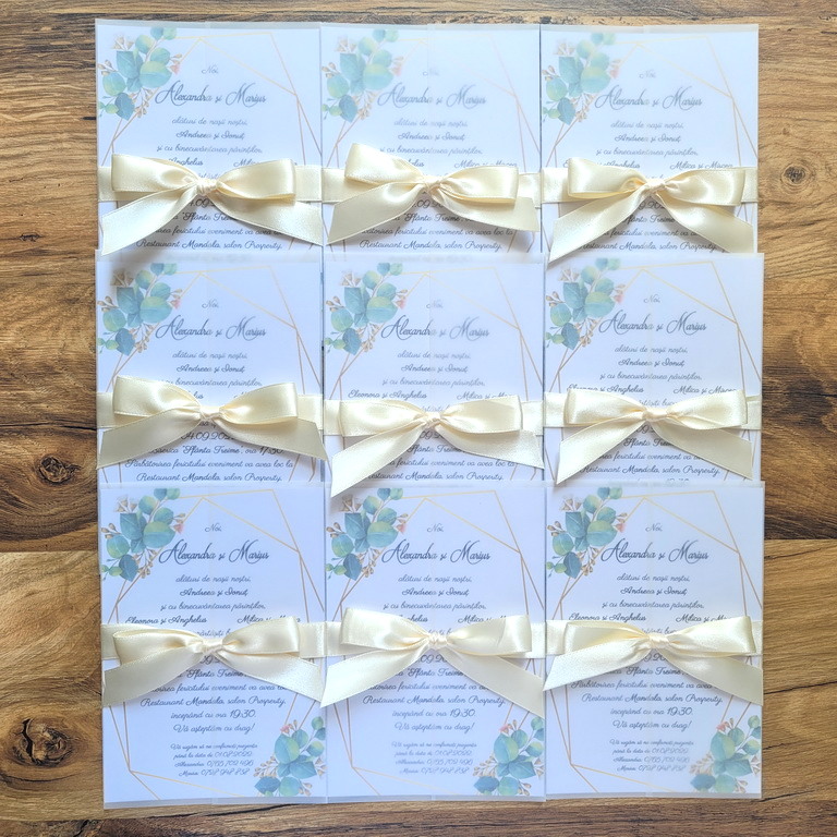 Invitatii de nunta cu chenar auriu geometric, frunze de eucalipt, realizate din carton alb sau ivory, invelite in hartie delicata de calc, legate cu fundite de buna calitate, care nu se desira