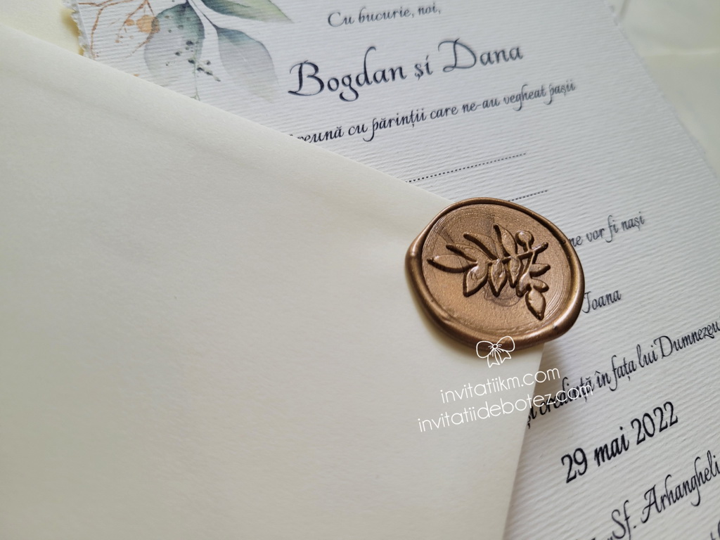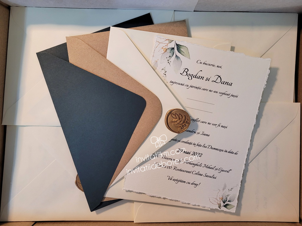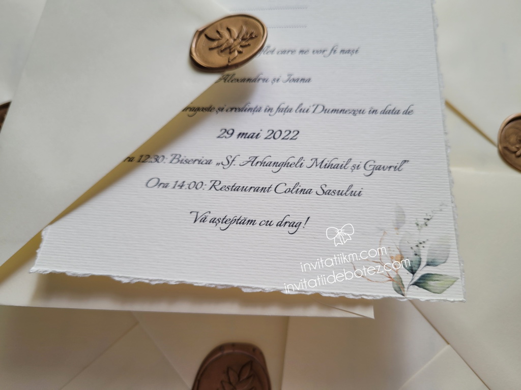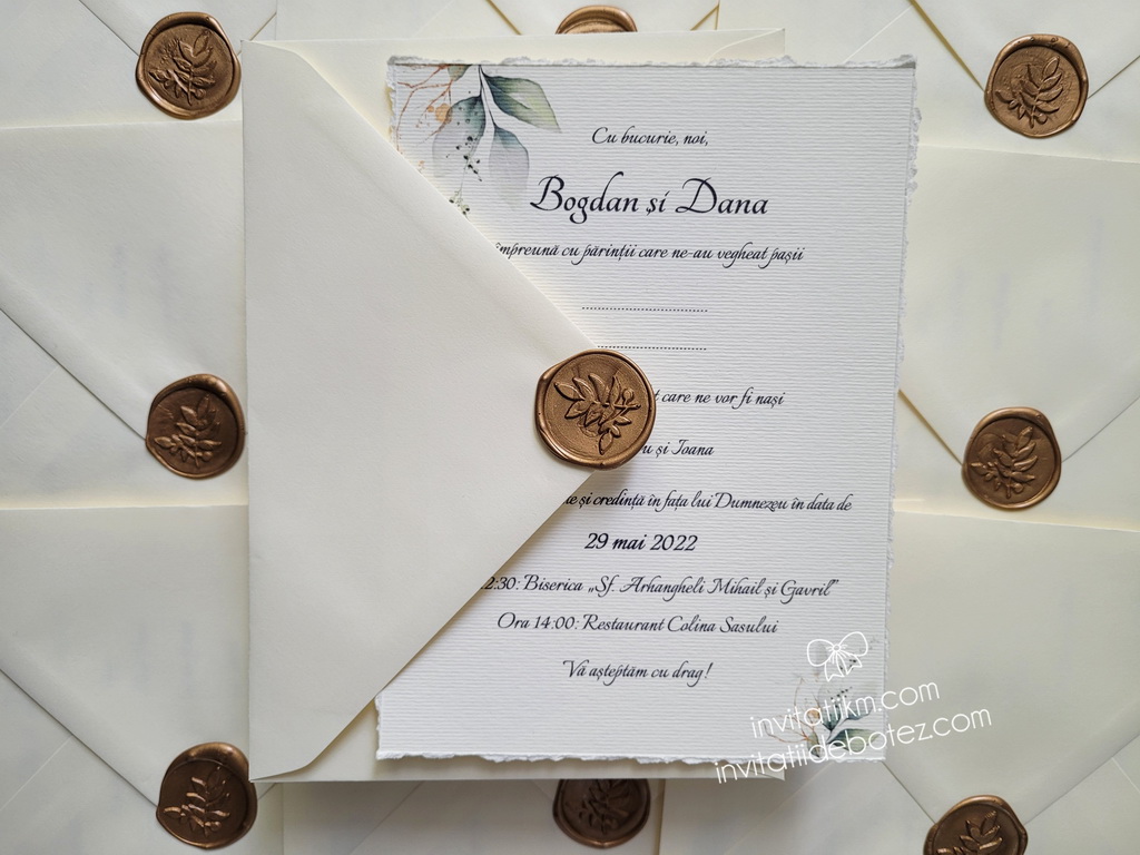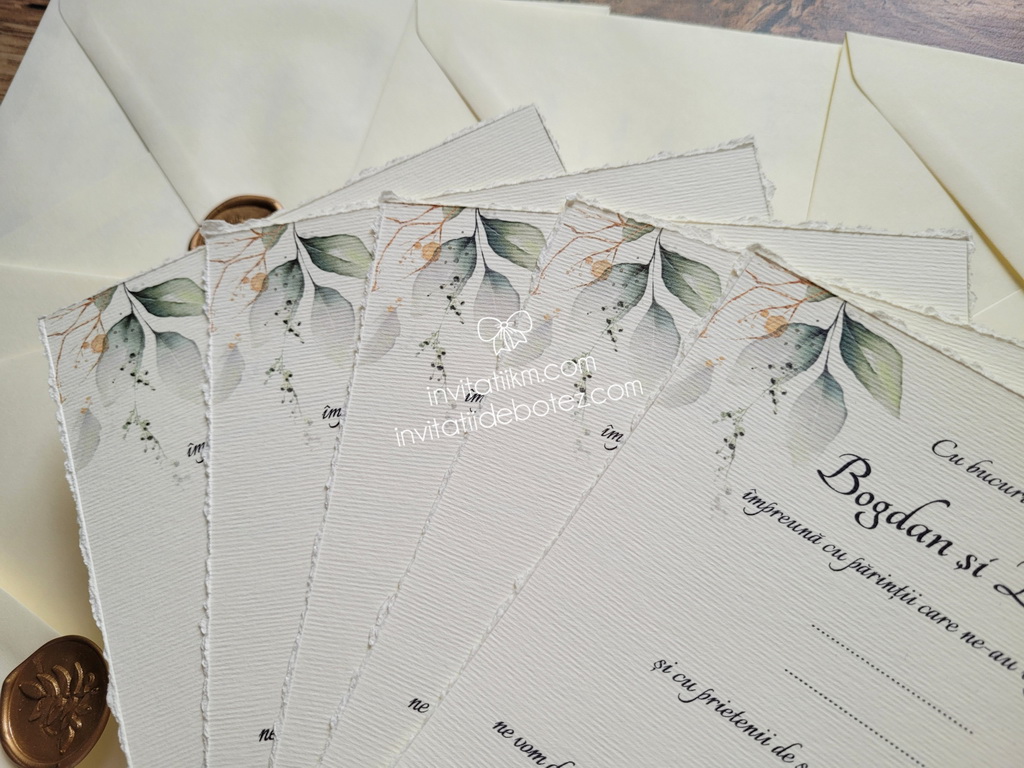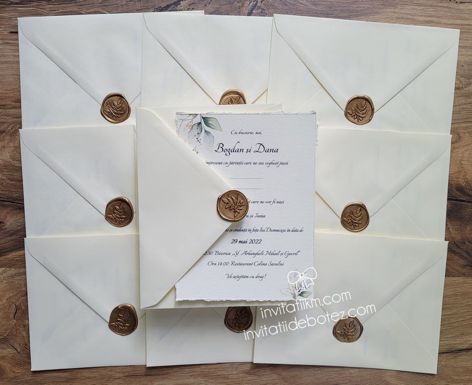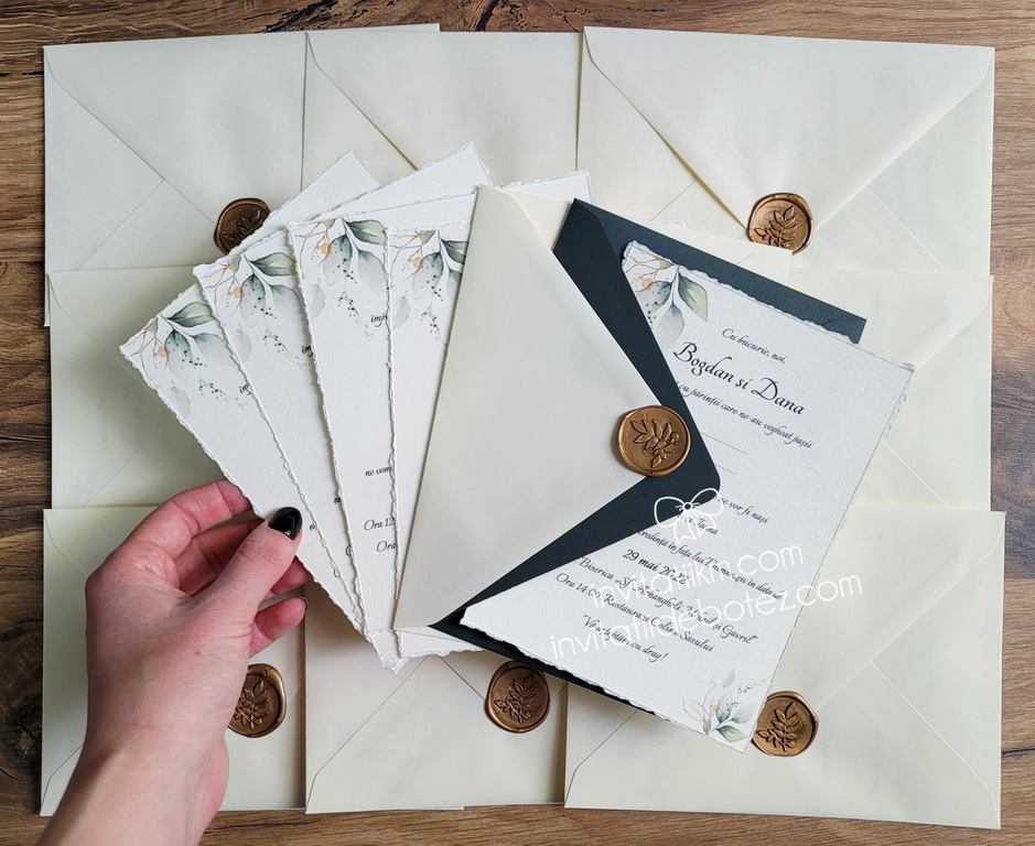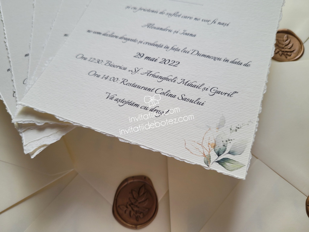 Invitatii de nunta cu verdeata/frunze verzi si detalii aurii realizate din carton ivory texturat, cu marginile neregulate, rupte manual si sigiliu asortat (sigiliul este turnat la cald direct pe plic)