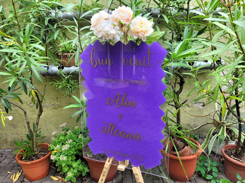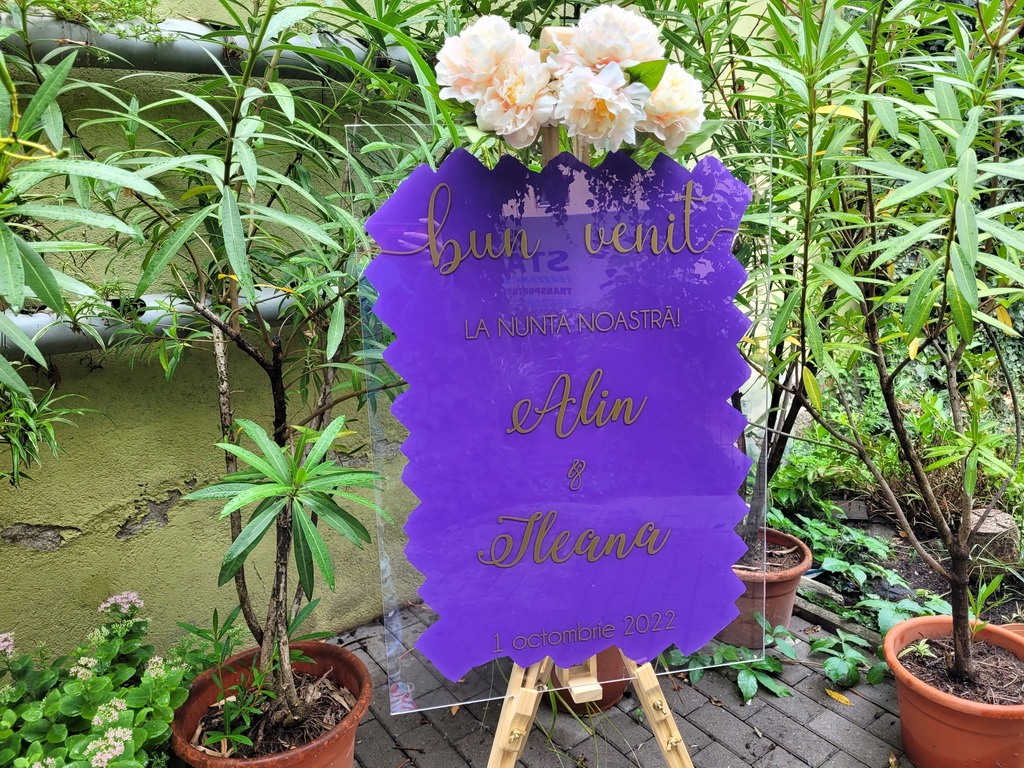 Panou de intampinare a invitatilor pentru nunta sau botez, realizat din plexiglas transparent, personalizat cu text din autocolant auriu si vopsit in diverse culori.