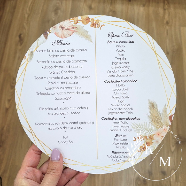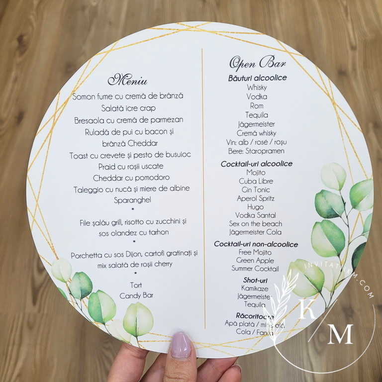 Meniuri individuale rotunde pentru nunta/botez realizate din carton. Meniul poate fi asezat pe fiecare farfurie