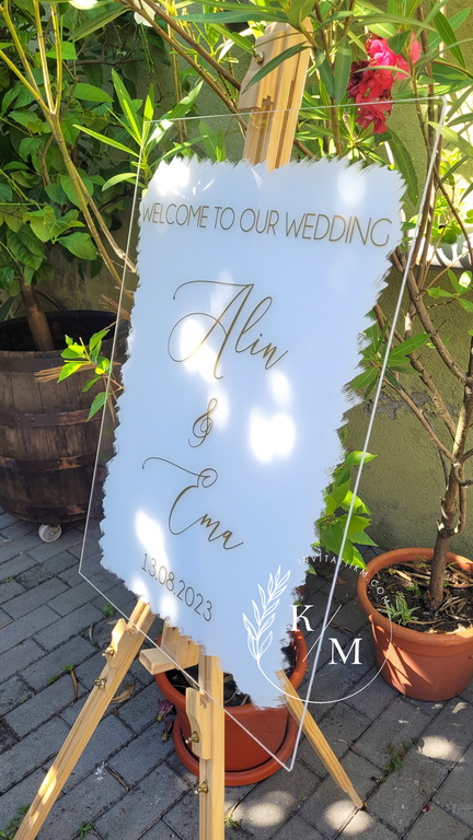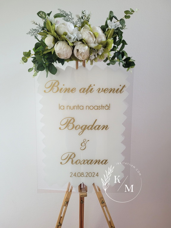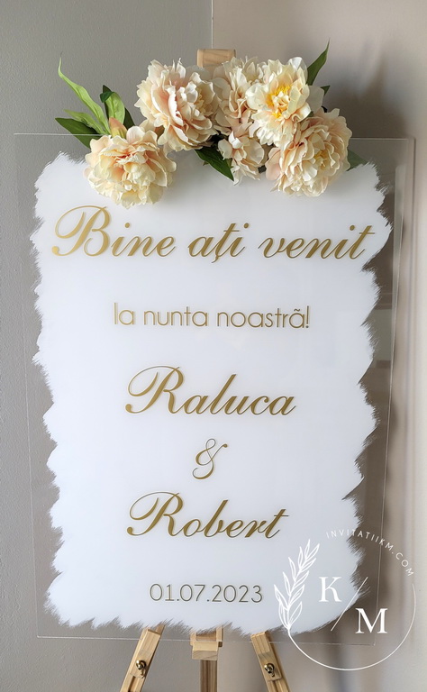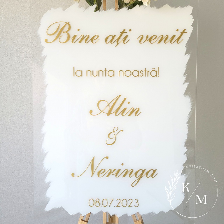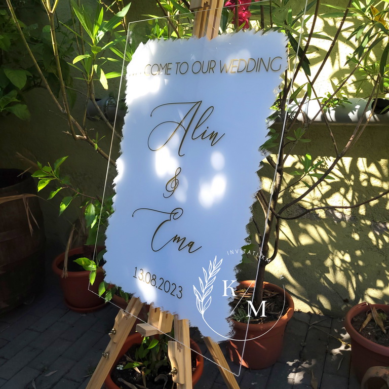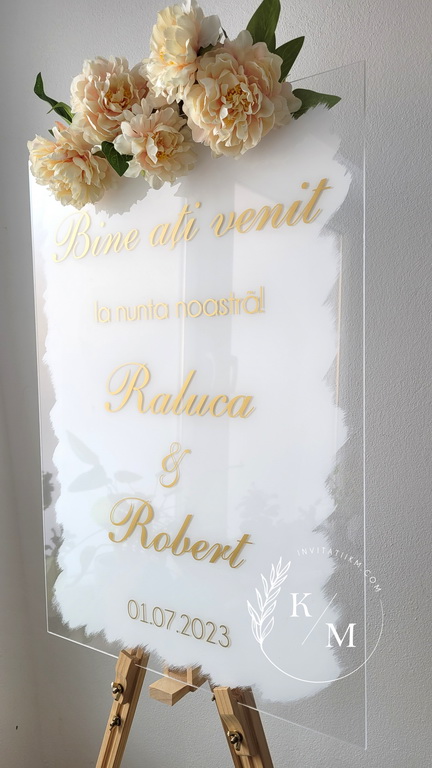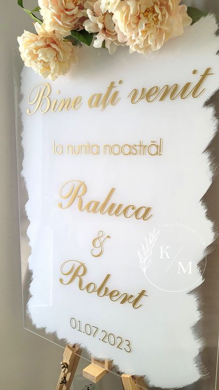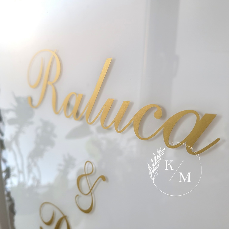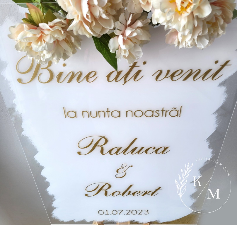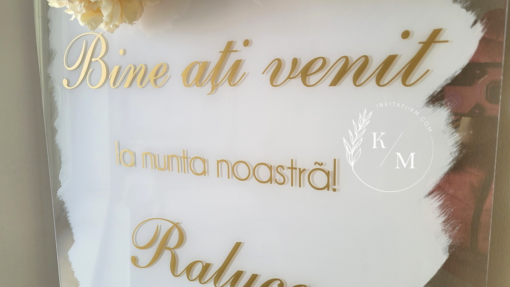 Panou de intampinare a invitatilor pentru nunta sau botez, realizat din plexiglas transparent, personalizat cu text din autocolant auriu si vopsit in diverse culori. Se pot realiza la fel si numere de masa, carduri de asezare.