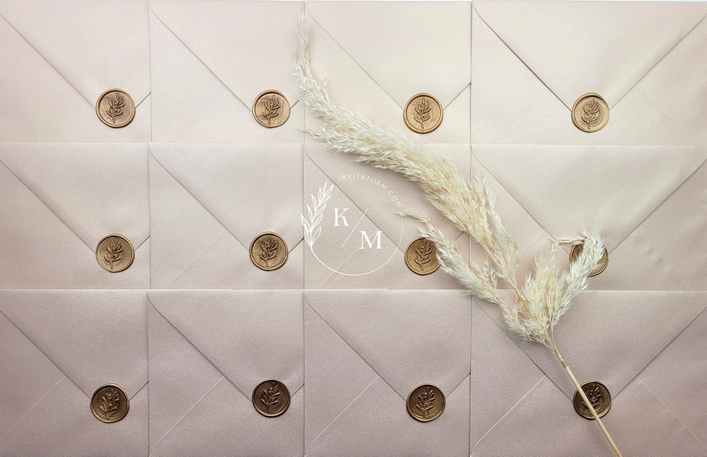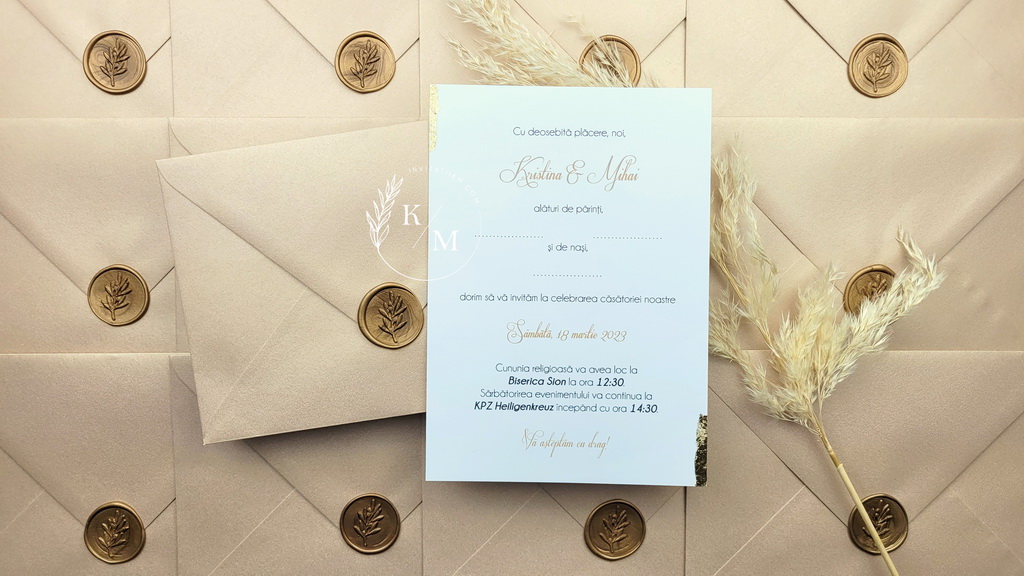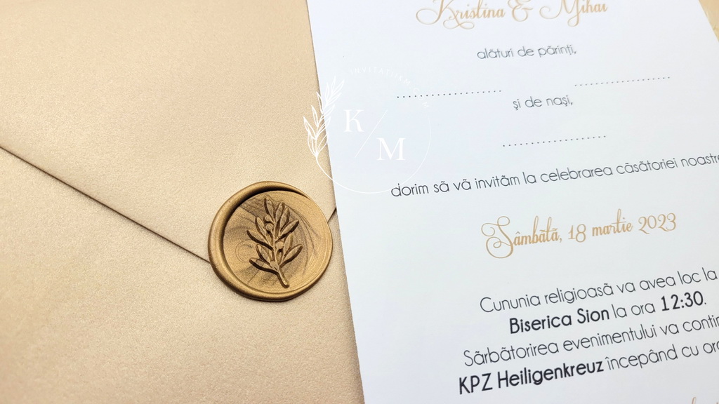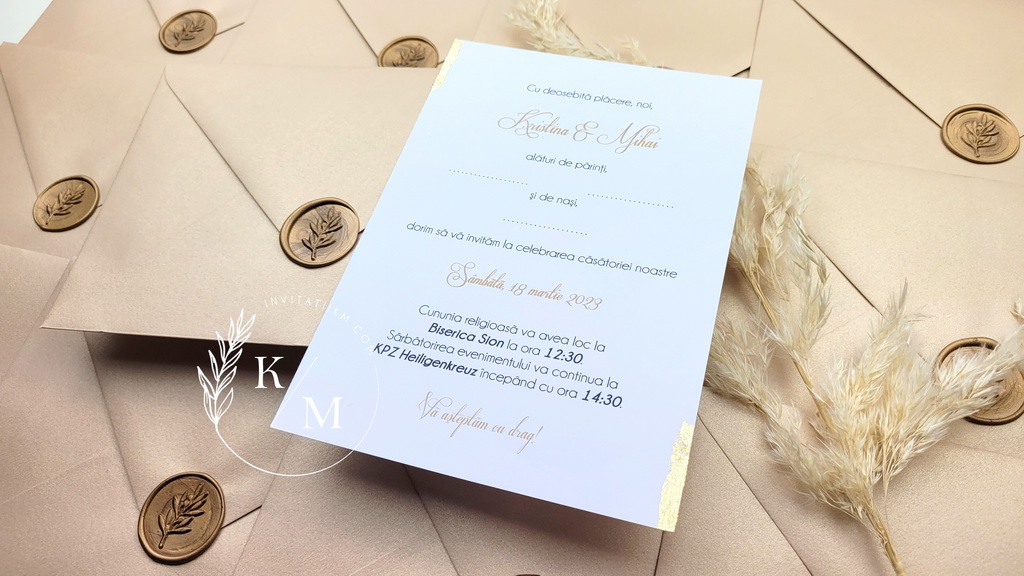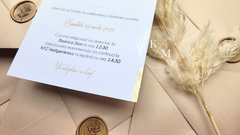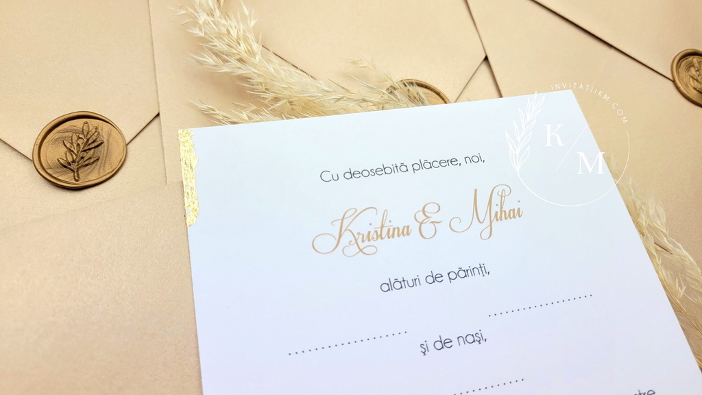 Invitatii de nunta elegante realizate din carton alb neted, detalii cu foita aurie aplicate manual, plic deosebit bej sidefat, inchise cu un sigiliu turnat la cald pe clapeta