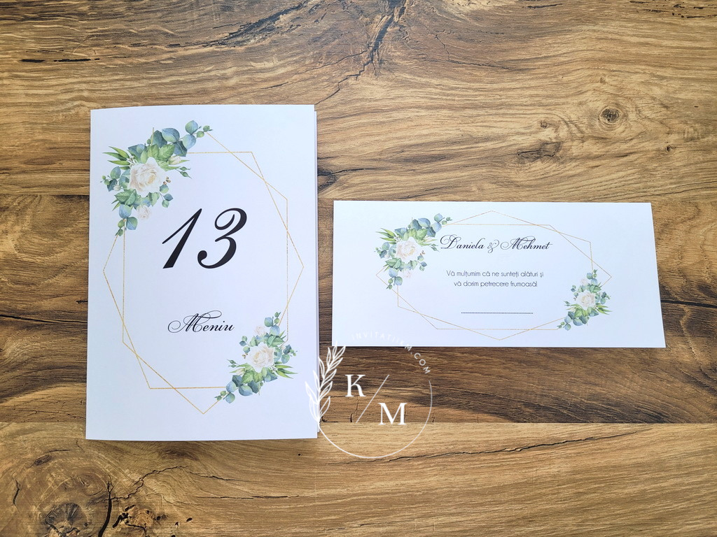 Meniuri si numere de masa 2 in 1, plicuri de bani, cu chenar geometric, verdeata/eucalipt si trandafiri crem
