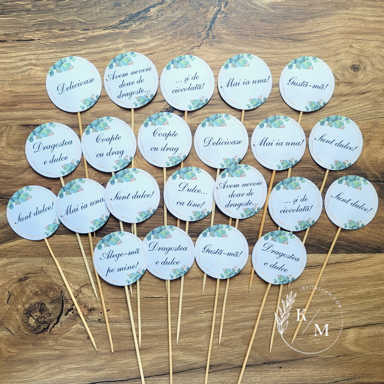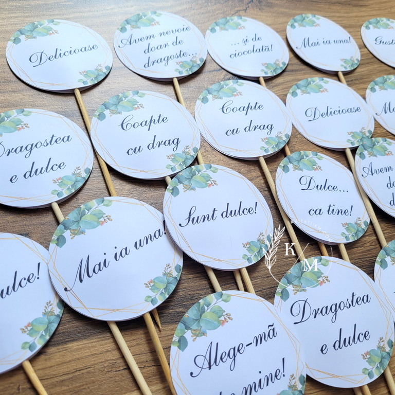 Mesaje medii pentru candy bar cu chenar geometric si frunze de eucalipt/verdeata