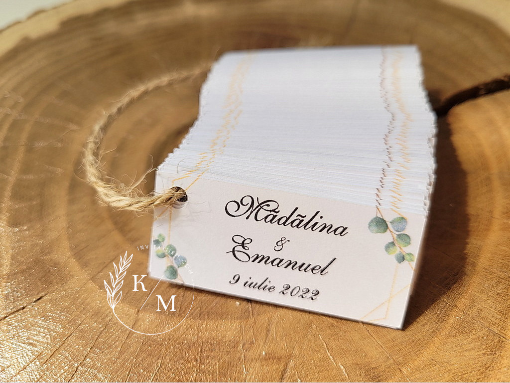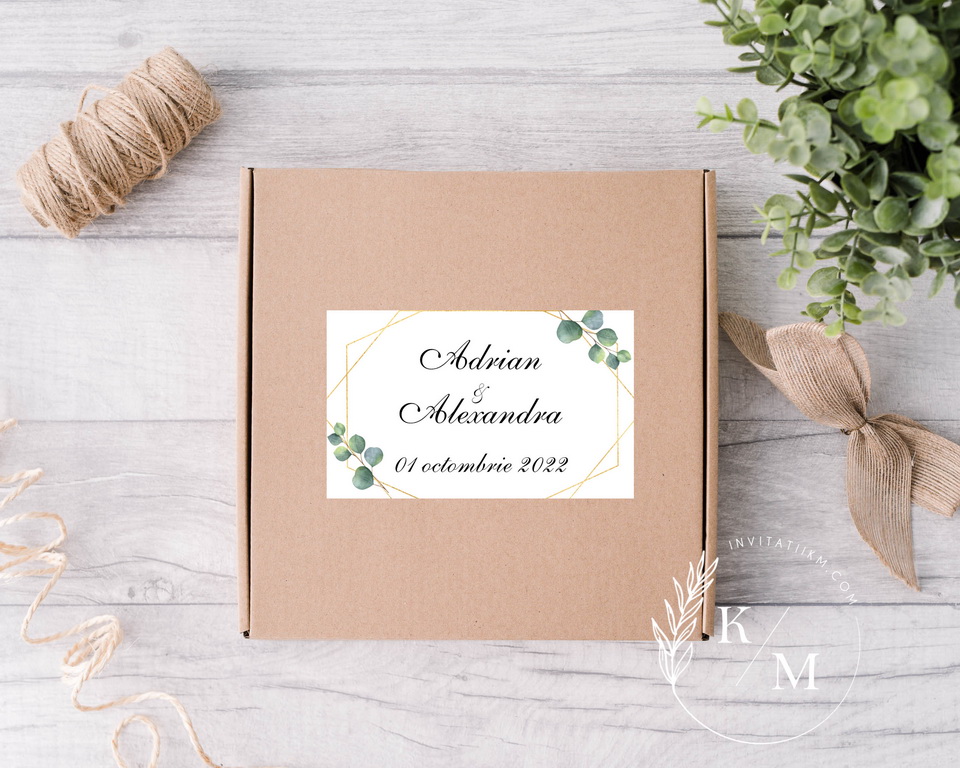 Stickere, etichete autoadezive cu chenar auriu mat si frunze de eucalipt/verdeata, pentru marturii de nunta/botez. Pot fi realizate din autocolant mat/lucios pentru a fi lipite sau pot fi din carton cu gaurica pentru a fi legate (se livreaza fara snur/sfoara).