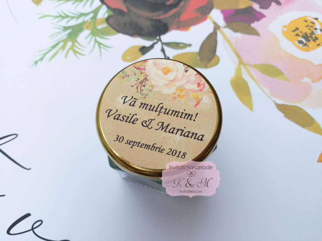 Etichete cu gaurica si stickere pentru borcanase/marturii de nunta cu design vintage si flori roz-piersica