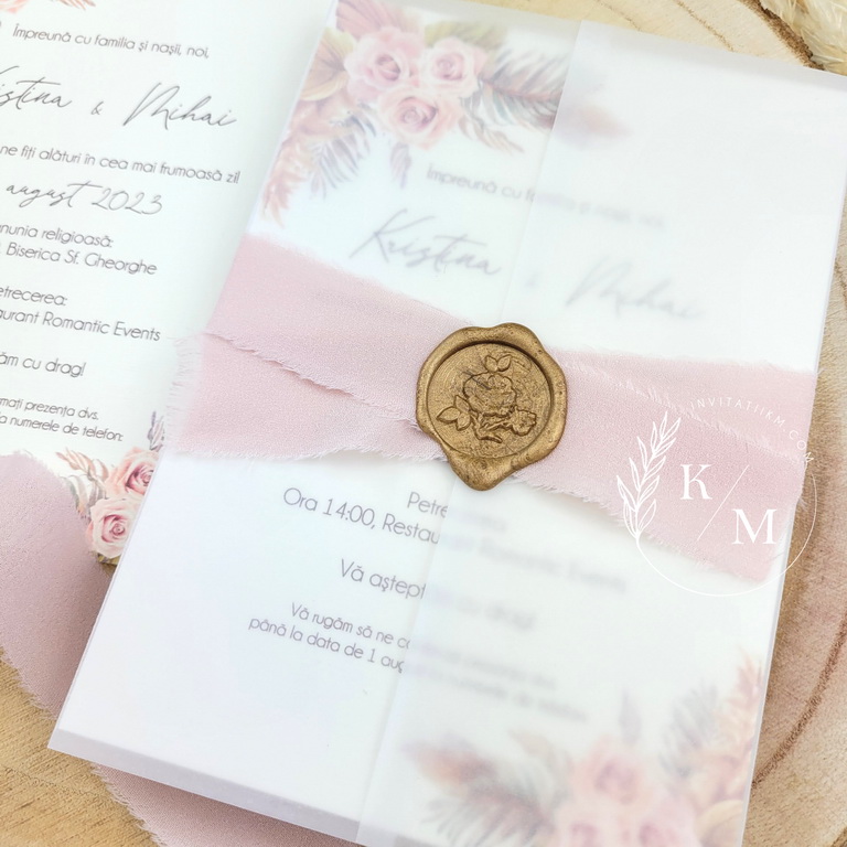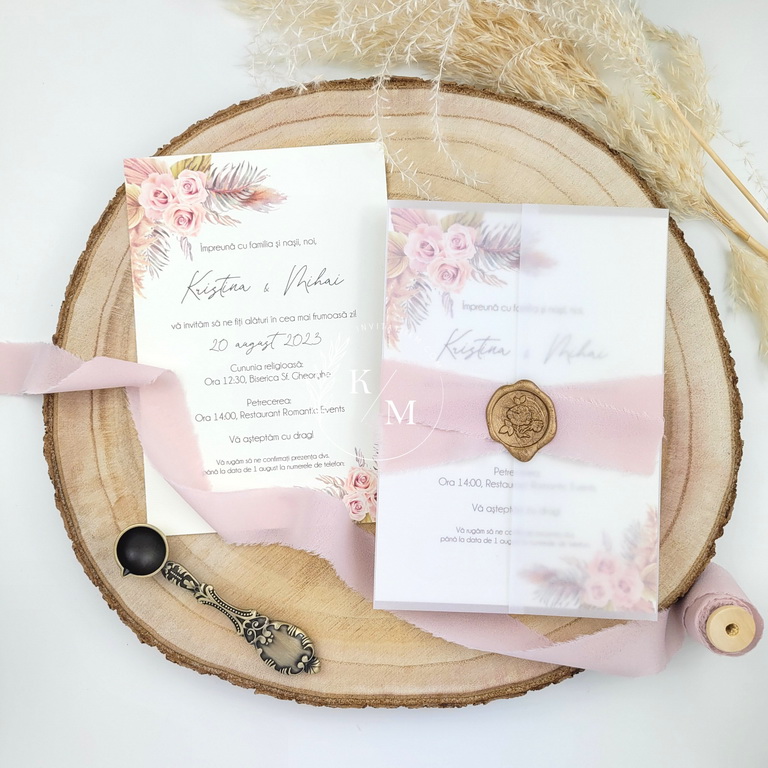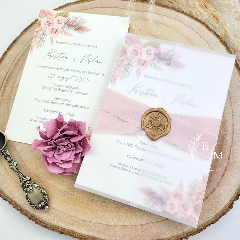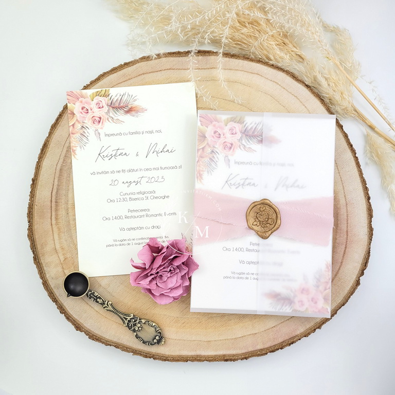 Invitatii de nunta florale, realizate din carton alb sau ivory, cu text simplu, buchete florale in stil boho, cu iarba de pampas, trandafiri roz antic, invelite in hartie delicata de calc, legate cu panglica din voal de matase + sigiliu